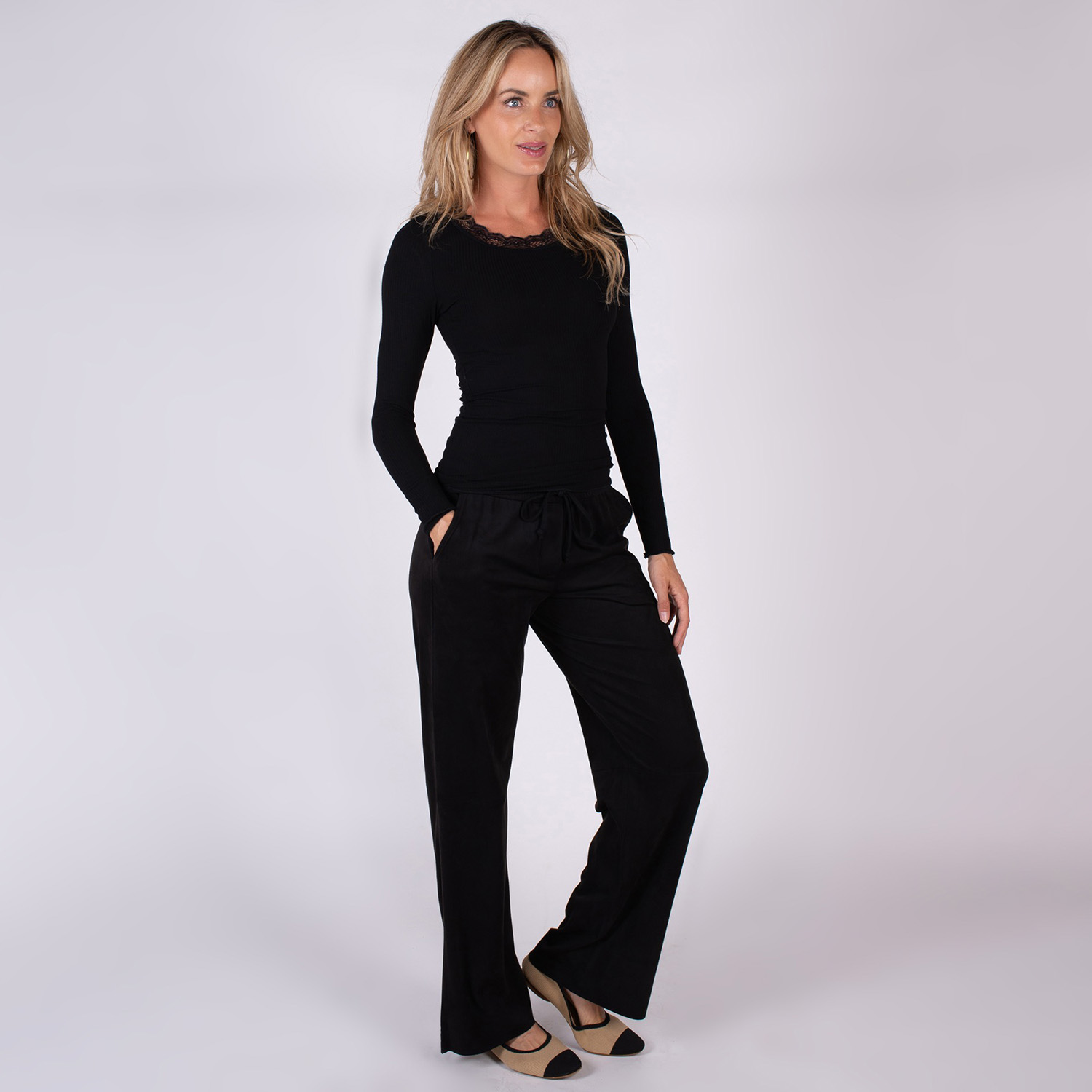 Deze prachtige top heeft een ronde hals en is afgewerkt aan zowel de voor- als achterkant met geschulpt kant. De top is gemaakt van een soepele, zacht geborstelde viscose jersey met extra stretch en is in de kleur zwart. De pasvorm is aangesloten en de top heeft lange mouwen.