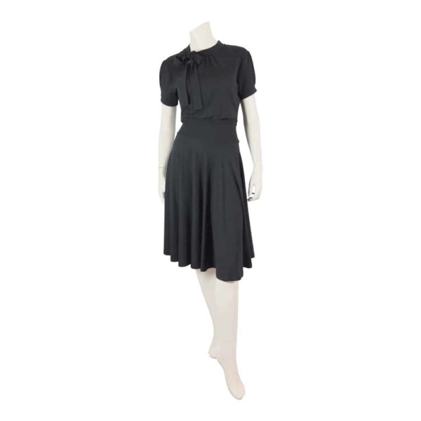 Deze zwierige charmante jurk in de stijlvol zwart, heeft een korte pofmouw, een druppelvormig splitje bij de hals en een breder striklint bij de hals. Het rokdeel bestaat uit een hele cirkelrok en draait prachtig om je heen. Mooi detail: zwarte tricot ceintuurtje in de taille.