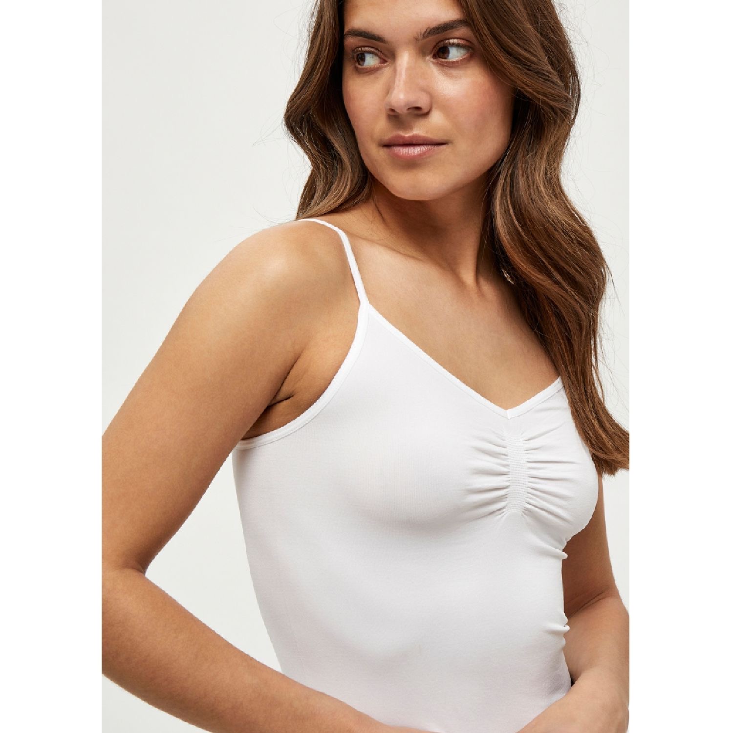 Deze Celine top van Minus is een verfijnd topje met een V hals in de kleur wit. Met een verstelbare schouderbandjes en een subtiel rimpeltje middenvoor voor een goede pasvorm die fijn overal onder past zonder dat je er iets van ziet.