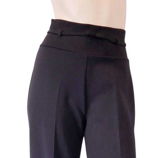 Deze broek met wijde pijp draag je sportief met een sneaker of wat meer gekleed met een hakje eronder. Het is een model welke wat strakker rond de taille/heup zit en daardoor erg mooi afkleedt. Het is gemaakt van een stevig iets rekbaar materiaal in een viscose/polyamide blend. In de taille 5 lusjes met  er door heen een vast ceintuurtje van dezelfde stof.