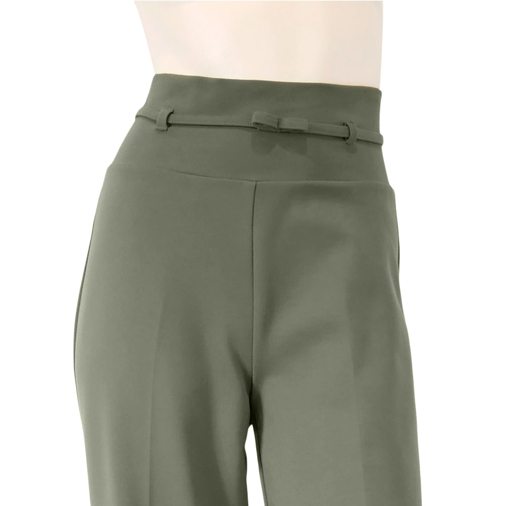 Deze broek met wijde pijp draag je sportief met een sneaker of wat meer gekleed met een hakje eronder. Het is een model welke wat strakker rond de taille/heup zit en daardoor erg mooi afkleedt. Het is gemaakt van een stevig iets rekbaar materiaal in een viscose/polyamide blend. In de taille 5 lusjes met  er door heen een vast ceintuurtje van dezelfde stof.