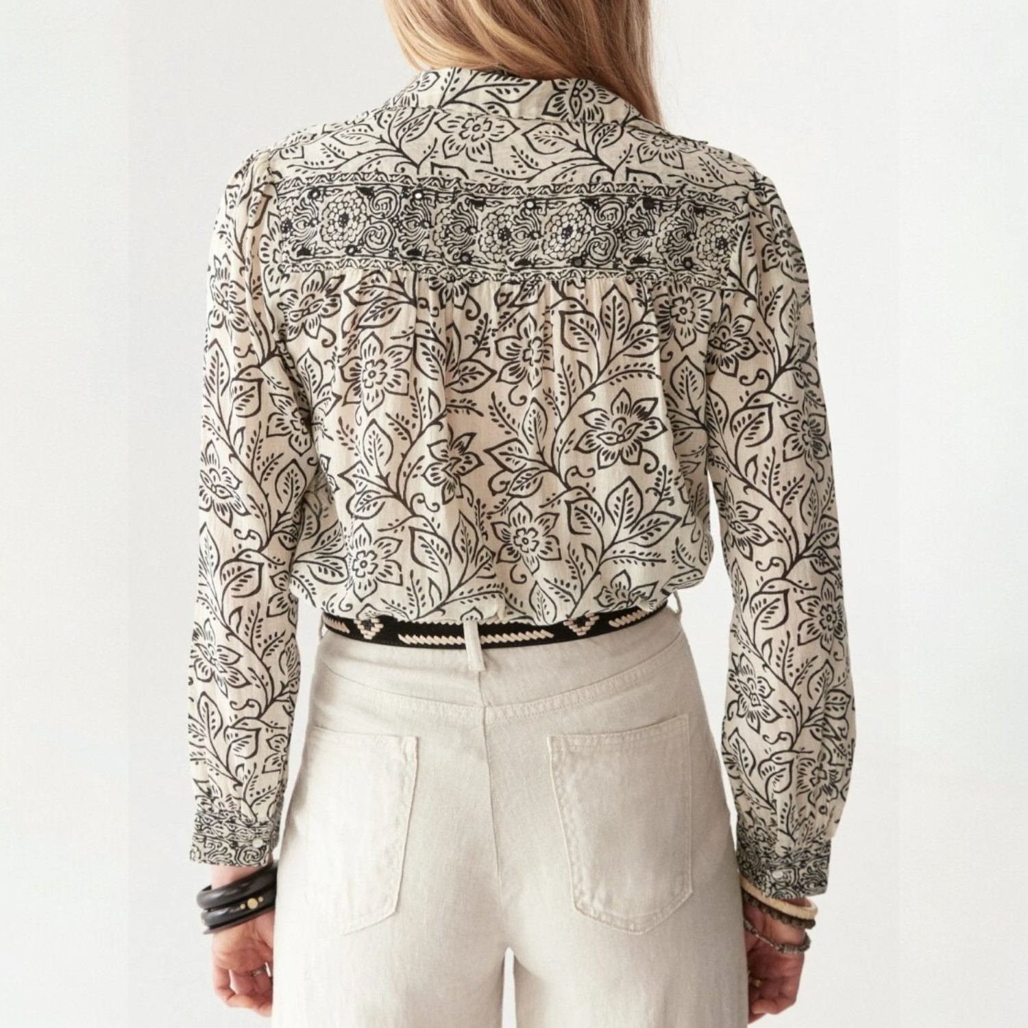De rechte pasvorm heeft iets weg van een mannenoverhemd, maar wordt verzacht door borduurwerk op de schouders en manchetten. Die fijne details geven de blouse een eigen karakter, subtiel en toch opvallend.