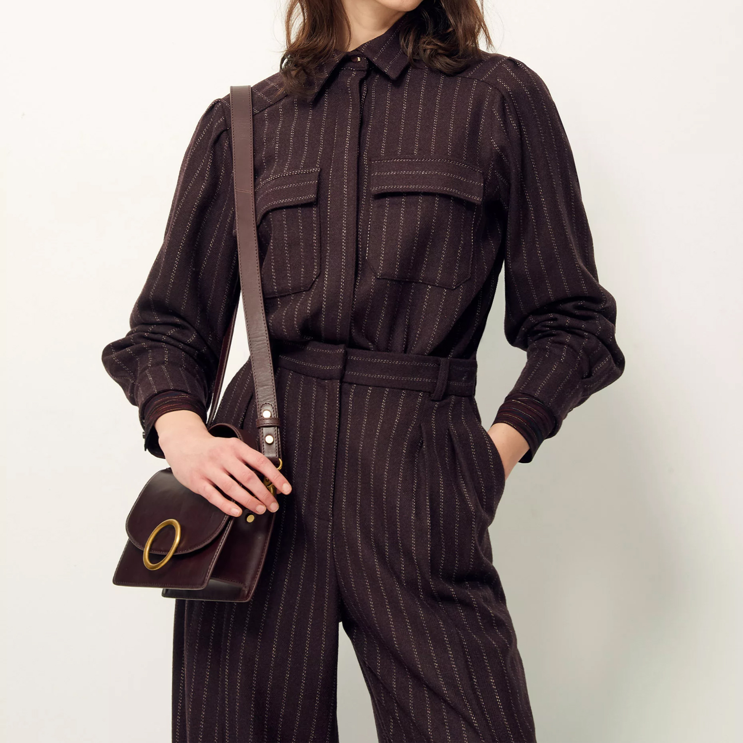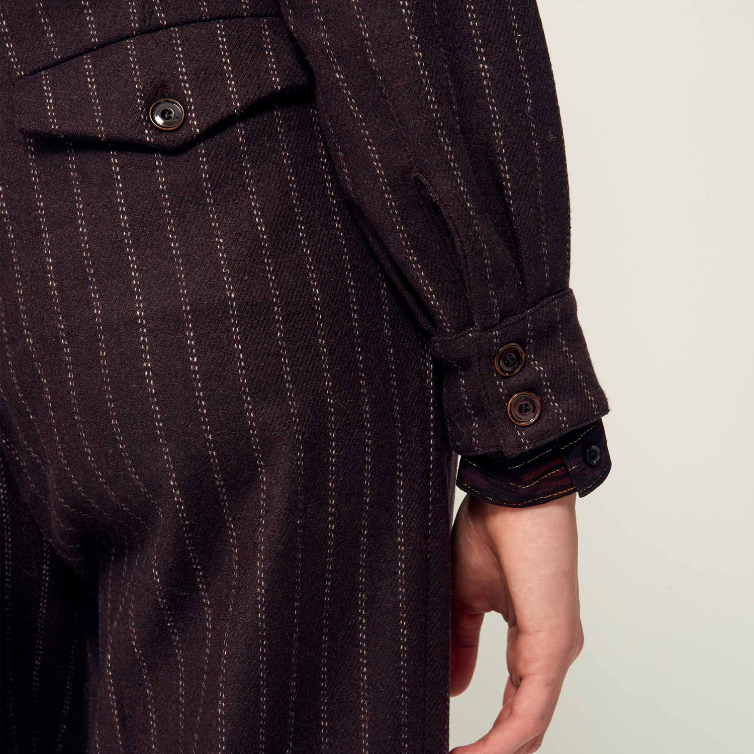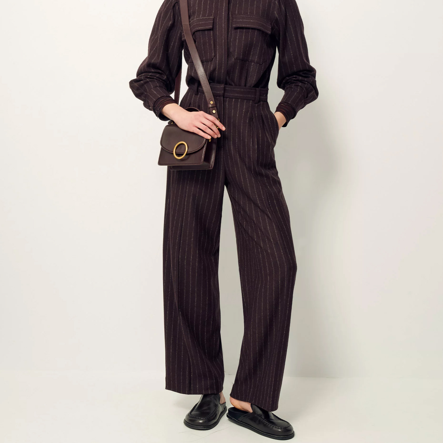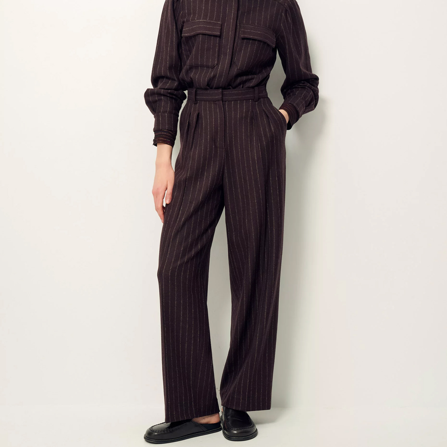 De Emilio Pantalon in de kleur Coffea, van het label Sessùn. Een rechte broek in mannelijke stijl van tennisgestreepte getextureerde flanelstof, geweven in Italië. De broek heeft platte plooien aan de voorzijde, een verborgen ritssluiting met knoop in de taille, schuine zakken en paspelzakken aan de achterkant, waarvan één met knoopflap.
