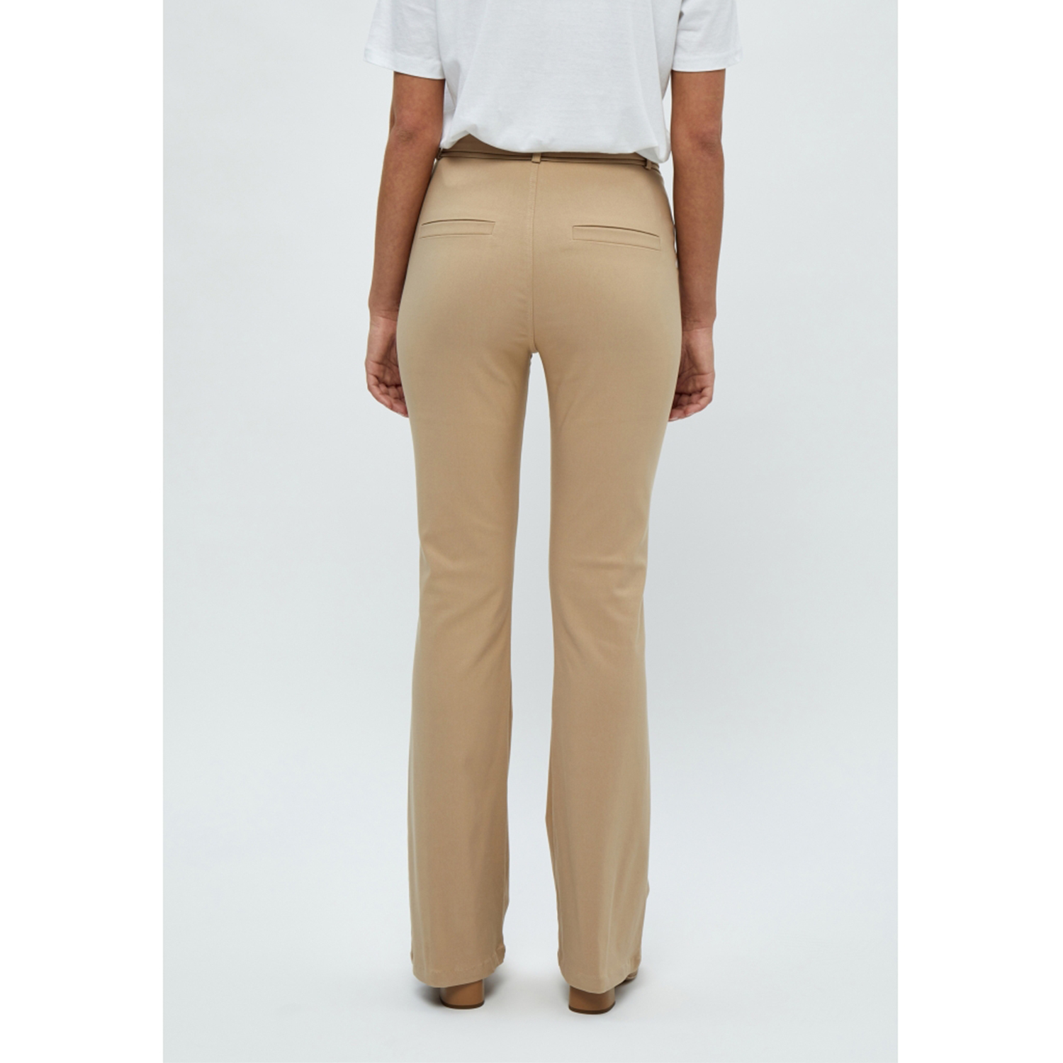 Onze bekende Carma-broek in Nomad Sand van Minus maar dan met een flared pijp. Deze rekbare broek heeft een pasvorm die zowel bij casual shirts/tops als bij vrouwelijke partytops past. De pasvorm is ietwat aangesloten tot aan de knie en heeft dan een wijd uitlopende pijp, paspelzakken aan de achterkant en het heeft zakken aan de voorkant. En een tailleband met kleine details. Super stretchy met veel draagcomfort.