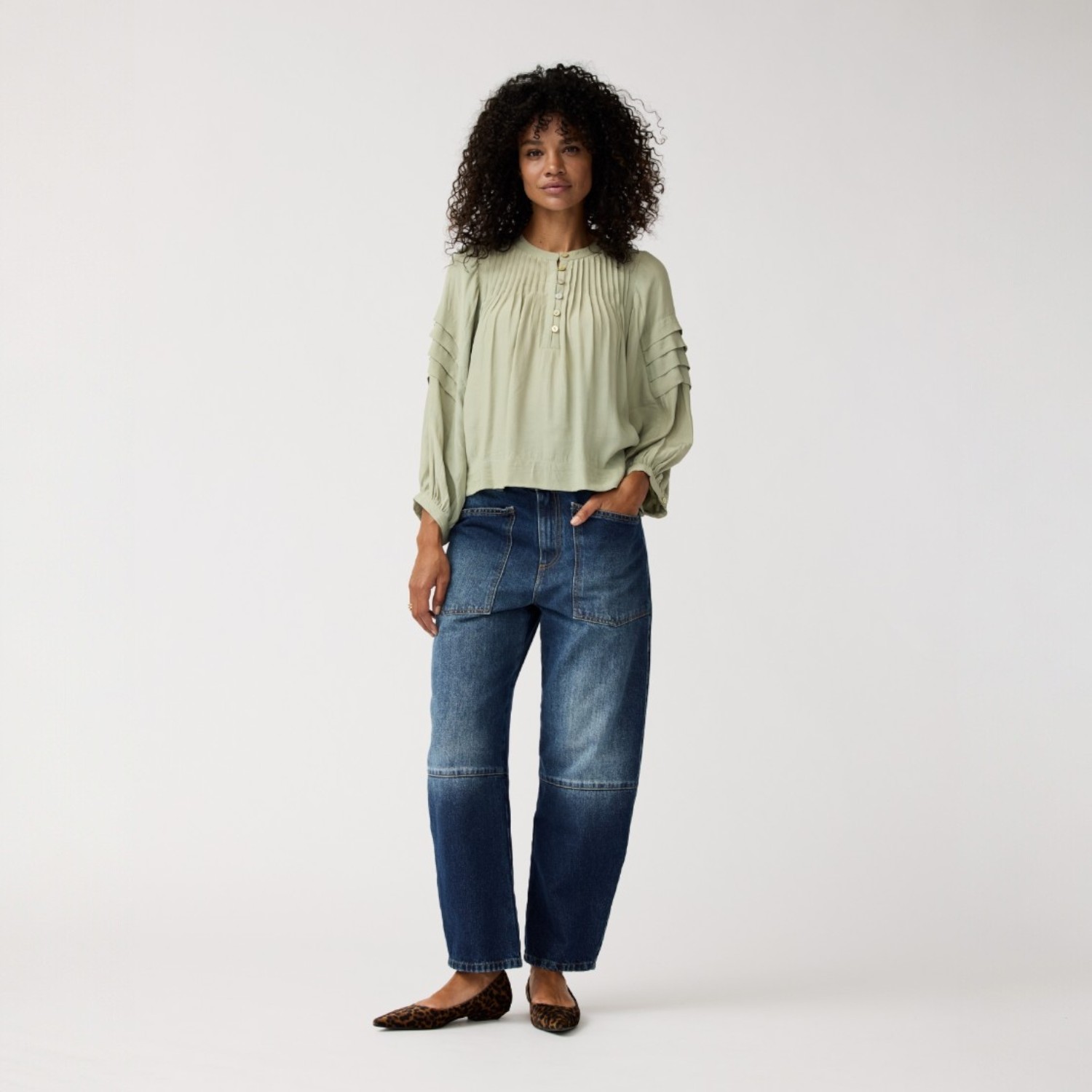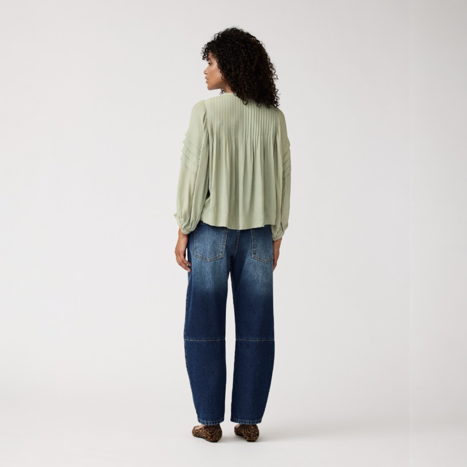 De Freya Top in de kleur Desert Sage van Alchemist is een losvallende top met een gesmokte voorkant en een ronde hals met knoopsluiting. Je kunt de hals gesloten dragen voor een nette look, of open voor een meer relaxte uitstraling.