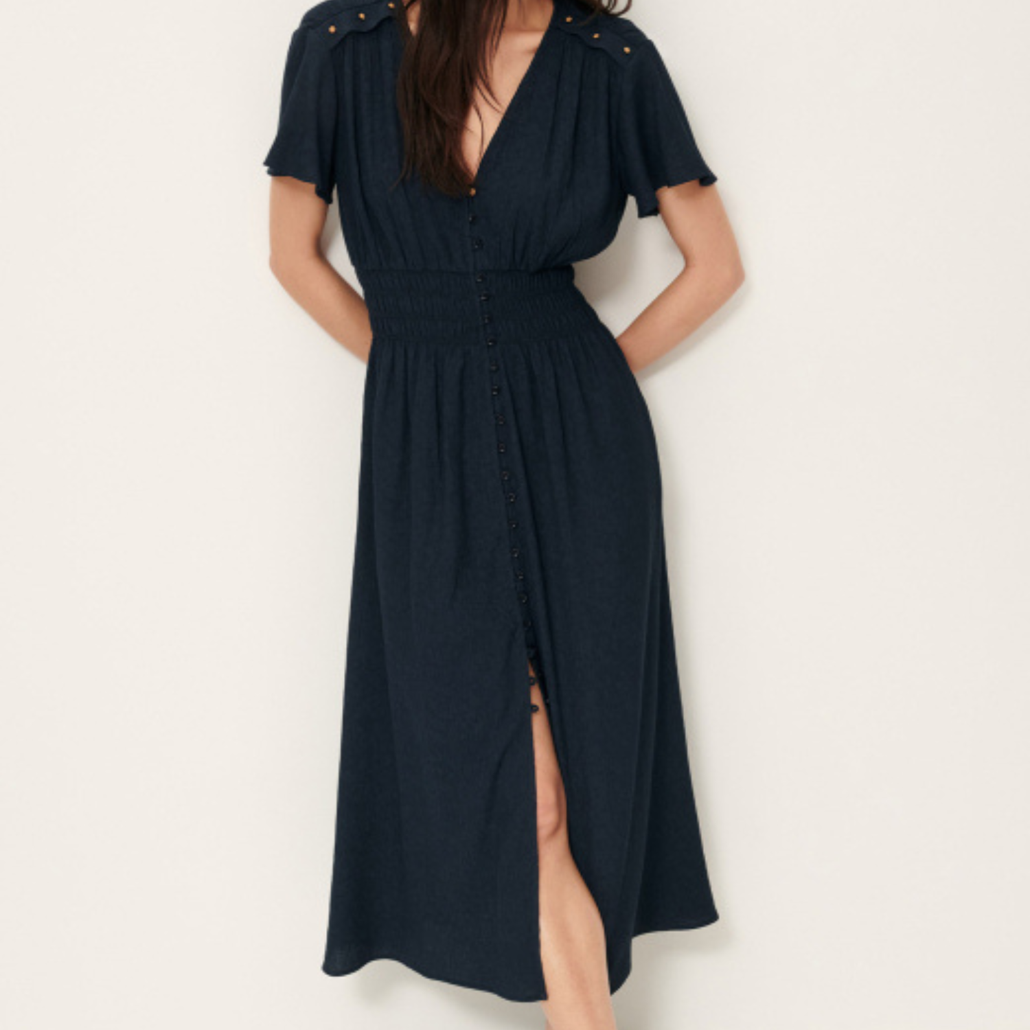 De Galaya Dress in de kleur Night Shadow van Sessùn is een elegante jurk die moeiteloos stijl en comfort combineert. Het ontwerp heeft een flatterende V-halslijn, korte vlindermouwen en een brede, gesmokte tailleband die zorgt voor een vrouwelijk silhouet. De doorknoopsluiting met fijne knoopjes geeft de jurk een subtiel detail, terwijl de zachte, vloeiende stof ervoor zorgt dat de jurk soepel meebeweegt bij iedere stap. Opvallend zijn de schouderdetails met kleine knoopaccenten, die de jurk een verfijnde en eigentijdse uitstraling geven.