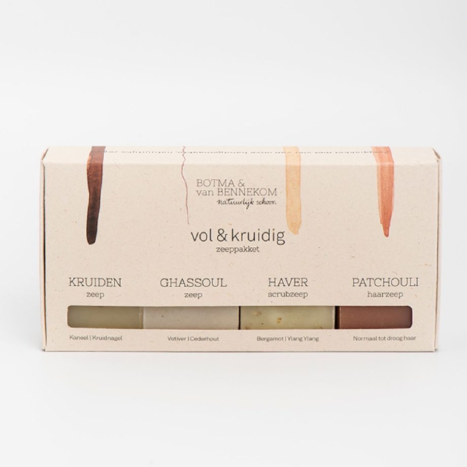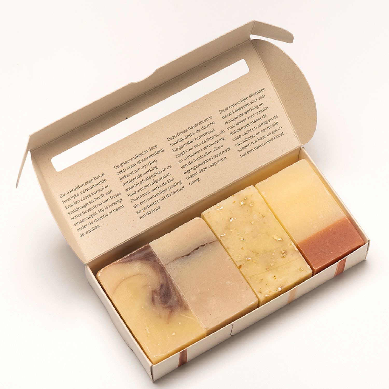 Dit mooie zeeppakket is geschikt als cadeau en voor degenen die niet kunnen kiezen. Het bevat twee lichaamszepen, een scrubzeep en een natuurlijke shampoo. Met dit pakket kan dus iedereen een lange tijd vooruit in de badkamer.