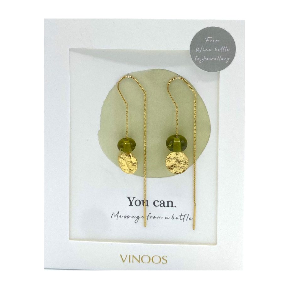 De Glass Earrings You Can in de kleur Vert d’eau Pâle (zeegroen) , van het label Vinoos. Deze prachtige sieraden zijn voor een gedeelte gemaakt van gerecyclede wijnflessen. Vinoos heeft een prachtige sieraden collectie ontwikkeld gebaseerd op de kleuren van wijn. Allemaal zijn ze gemaakt met glaskralen.