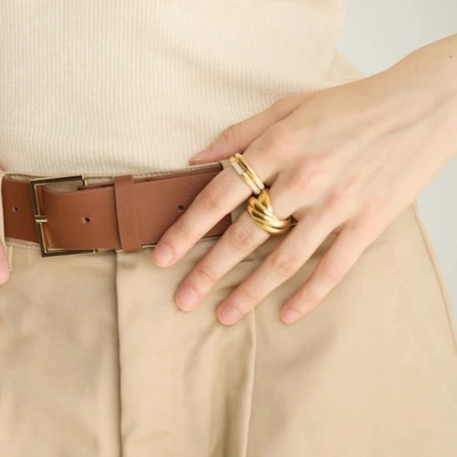 De handgemaakte ring is gemaakt van lokaal verkregen buffelbot en bevat een ethisch verantwoorde buis van 18-karaats verguld goud met een gouden band aan de binnenkant.
