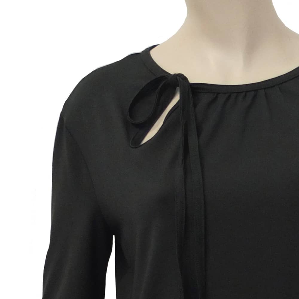 Dit shirt in diep zwart, draag je iets bloezend op rok of broek. Het heeft een lange mouw met onder aan een pofje. De hals is afgezet met een smal striklint van dezelfde stof en een druppelvormig splitje.