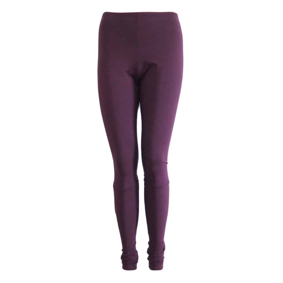 Deze legging, in een mooie, diep aubergine kleur, is aan de bovenzijde afgewerkt met een afstekend picotelastiek. Het heeft een naadje net onder de knie. En het fijne is dat hij erg lang is. Dus het rimpelt wat bij je enkel.