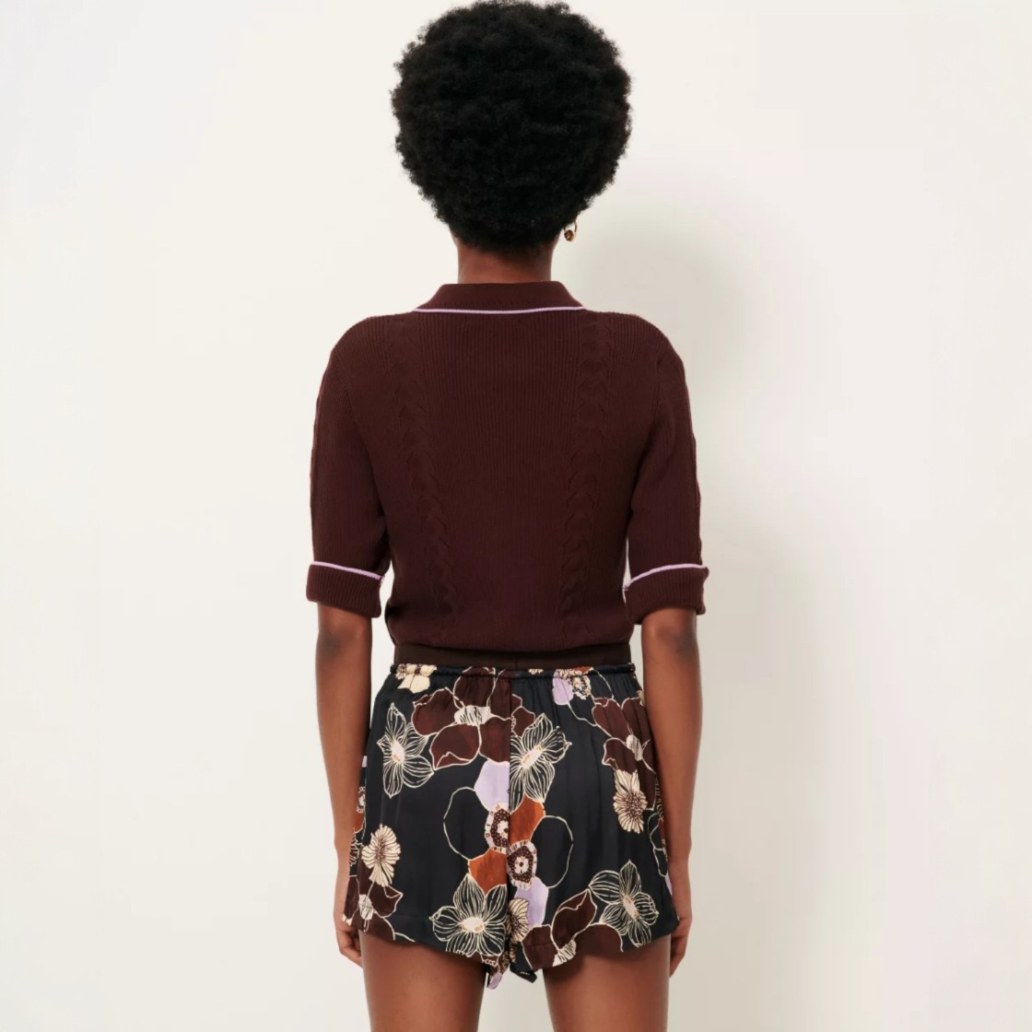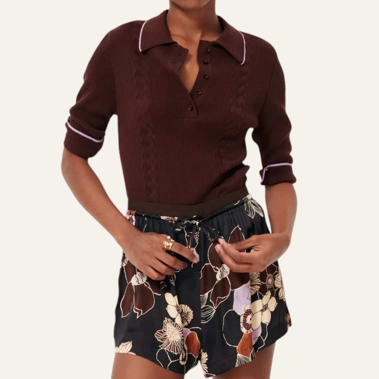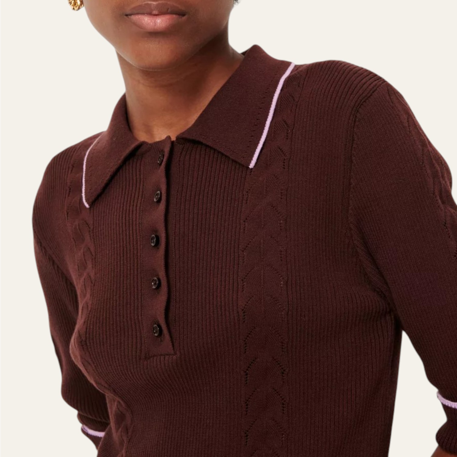 De Jodi Knitted Polo in de kleur Espresso, van het Franse label Sessùn, is een elegante en vrouwelijke top die moeiteloos comfort en stijl combineert. De ribgebreide stof is verrijkt met verfijnde opengewerkte details en geeft de polo een subtiele, luchtige structuur. De driekwartsmouwen en de contrasterende boorden aan de kraag en mouwen zorgen voor een eigentijds accent.