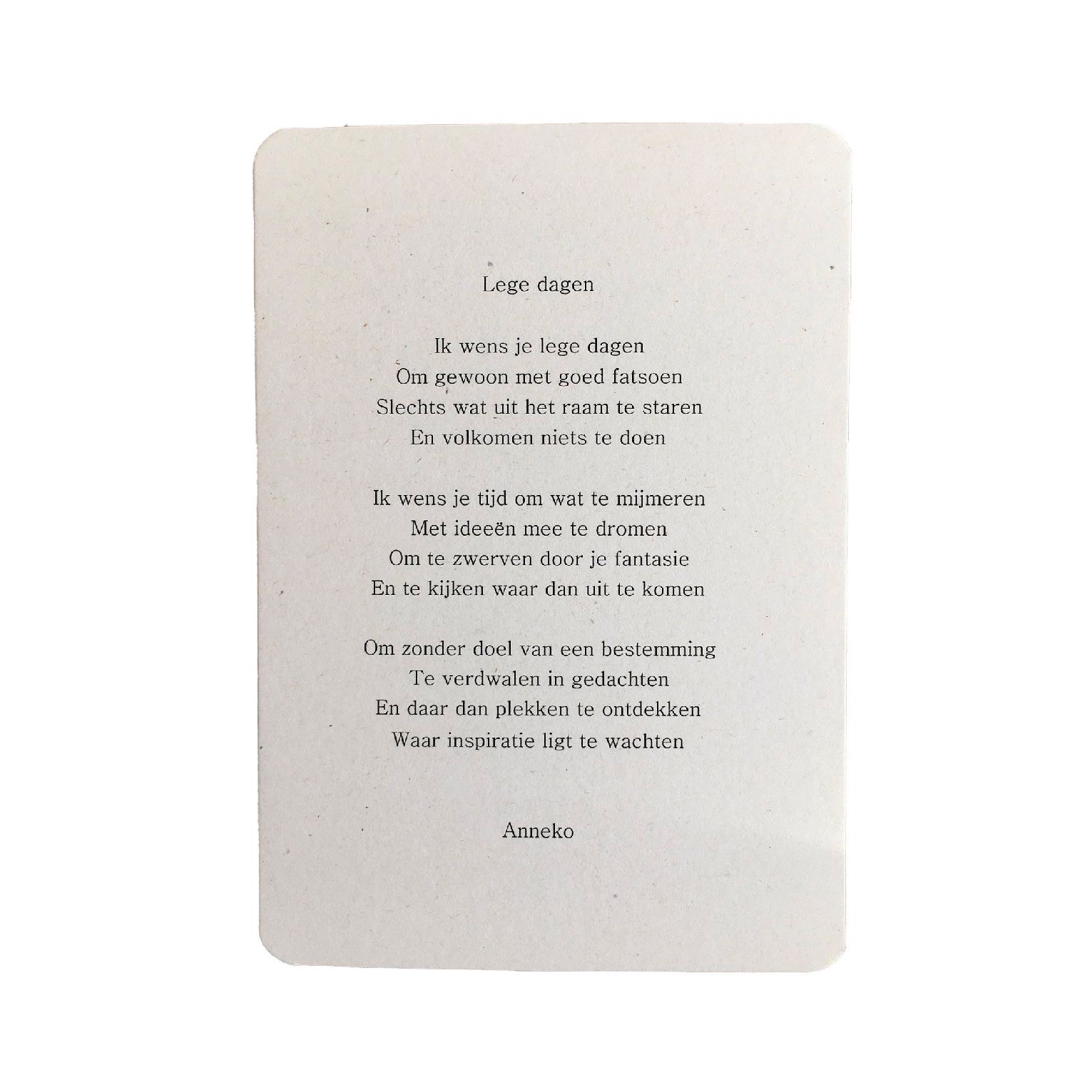 De postkaarten van Anneko, deze gaat over lege dagen. Anneko gelooft erin dat woorden ons veel goeds doen in het leven. Alle emoties die het leven met zich meebrengt brengt zij al schrijvend en sprekend aan het licht. En daar komen dit soort mooie kaarten uit.
