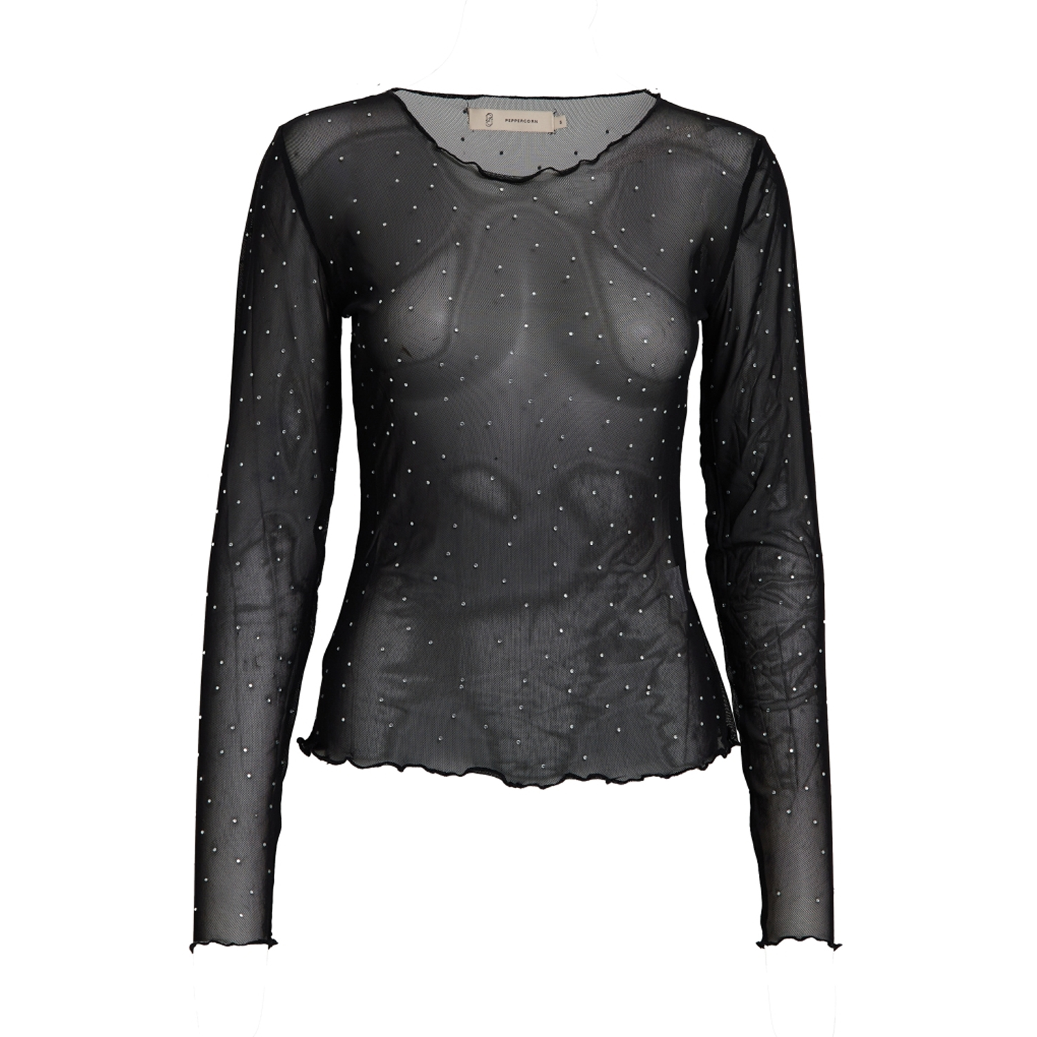 De Lia Mesh Top Black van Peppercorn. Deze Lia top is een zwarte, transparante longsleeve met glinsterende accenten verspreid over het geheel, wat zorgt voor een chique en verfijnde uitstraling. De boorden zijn versierd met ruffles.