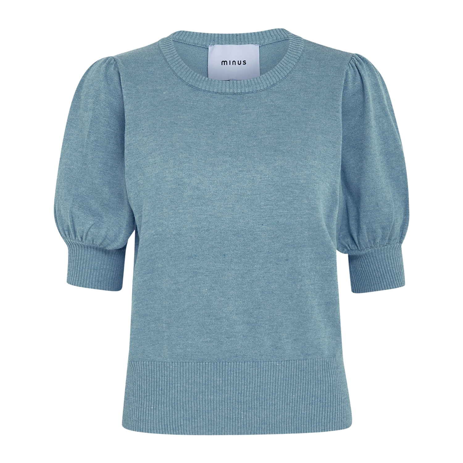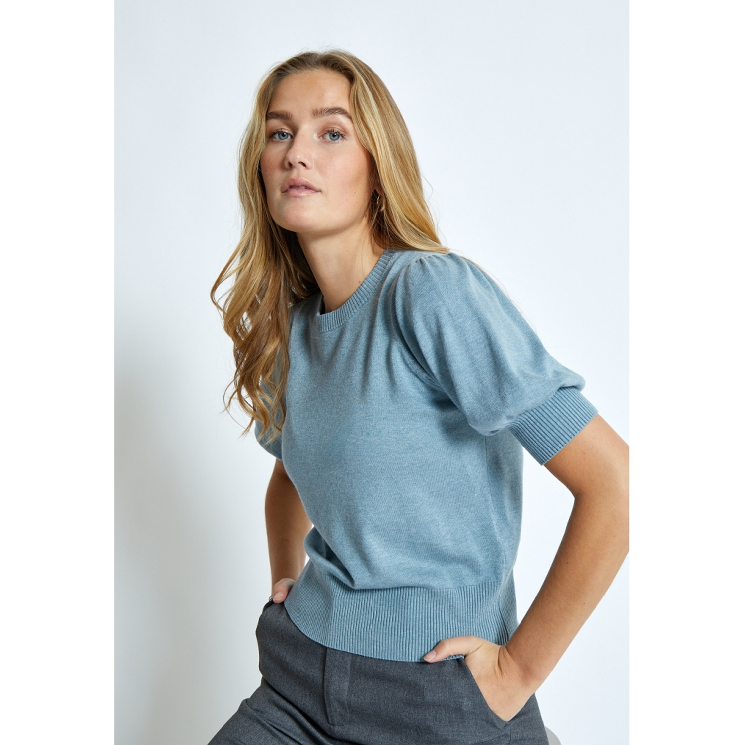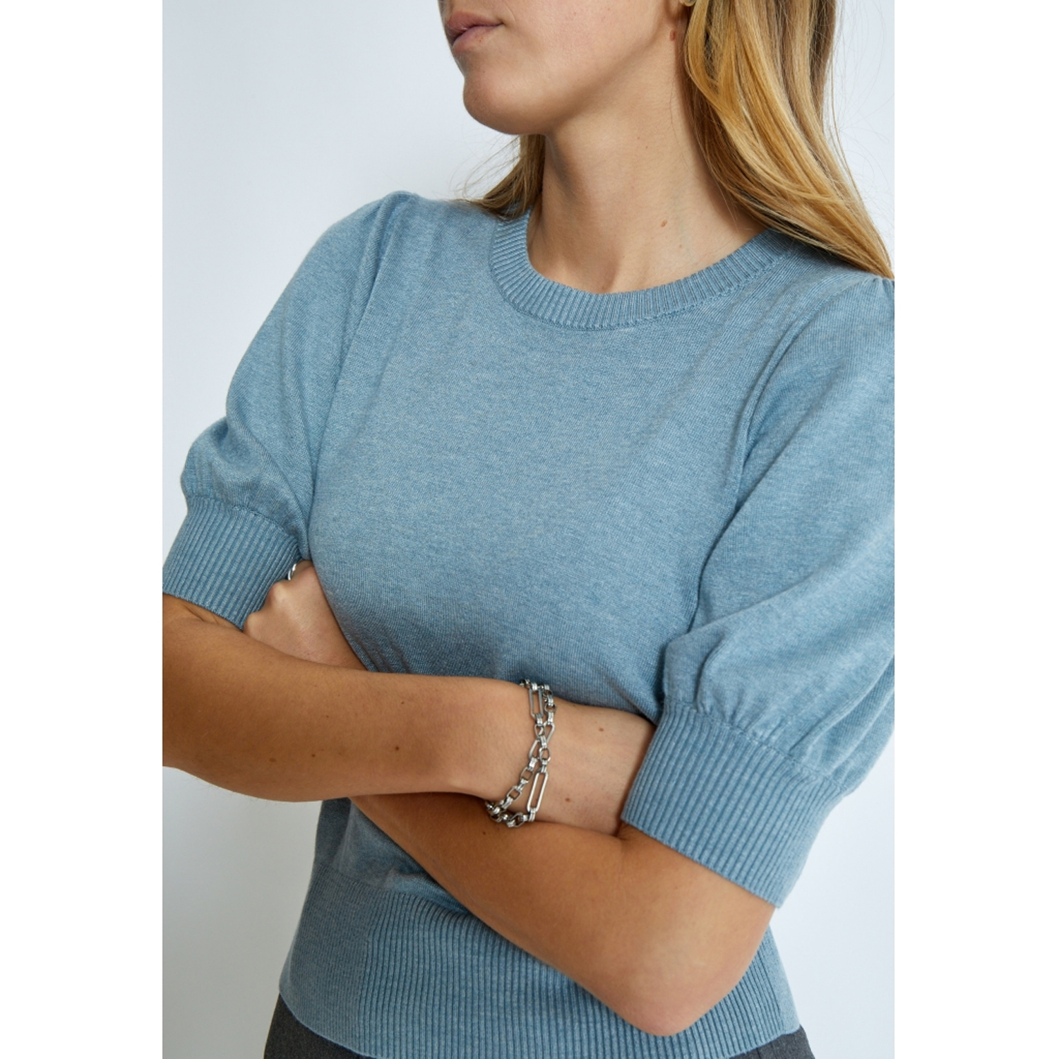 De Liva Knit Tee in de kleur Citadel Blue Melange, van het Deense label Minus. Het shirt is gebreid van een duurzame EcoVero viscose en is een heerlijk basis shirt wat altijd goed zit. Het ontwerp omvat een ronde halslijn en elegante korte pofmouwen tot aan de elleboog. Dankzij de iets strakkere boord op de heup krijgt het shirt een subtiel bloezend effect rond de buik, ideaal voor wie wat discretie wenst.