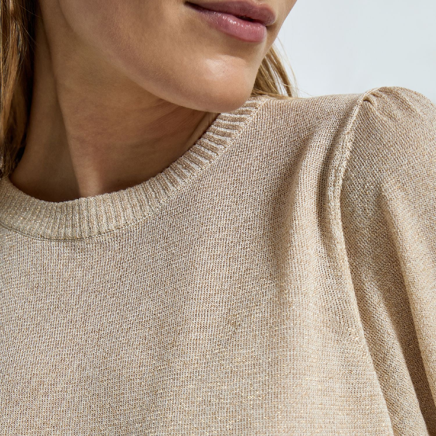 De Liva Knit Tee in de kleur Medal Gold Metallic, van het Deense label Minus. Het shirt is gebreid van een duurzame ecoVero viscose en is een heerlijk basis shirt wat altijd goed zit. Het heeft een ronde hals en een korte pofmouw tot in de elleboog. Door de iets strakkere boord op de heup heeft het shirt wat ruimte op de buik waardoor het eventueel ook wat verhult wat je niet wilt laten zien.