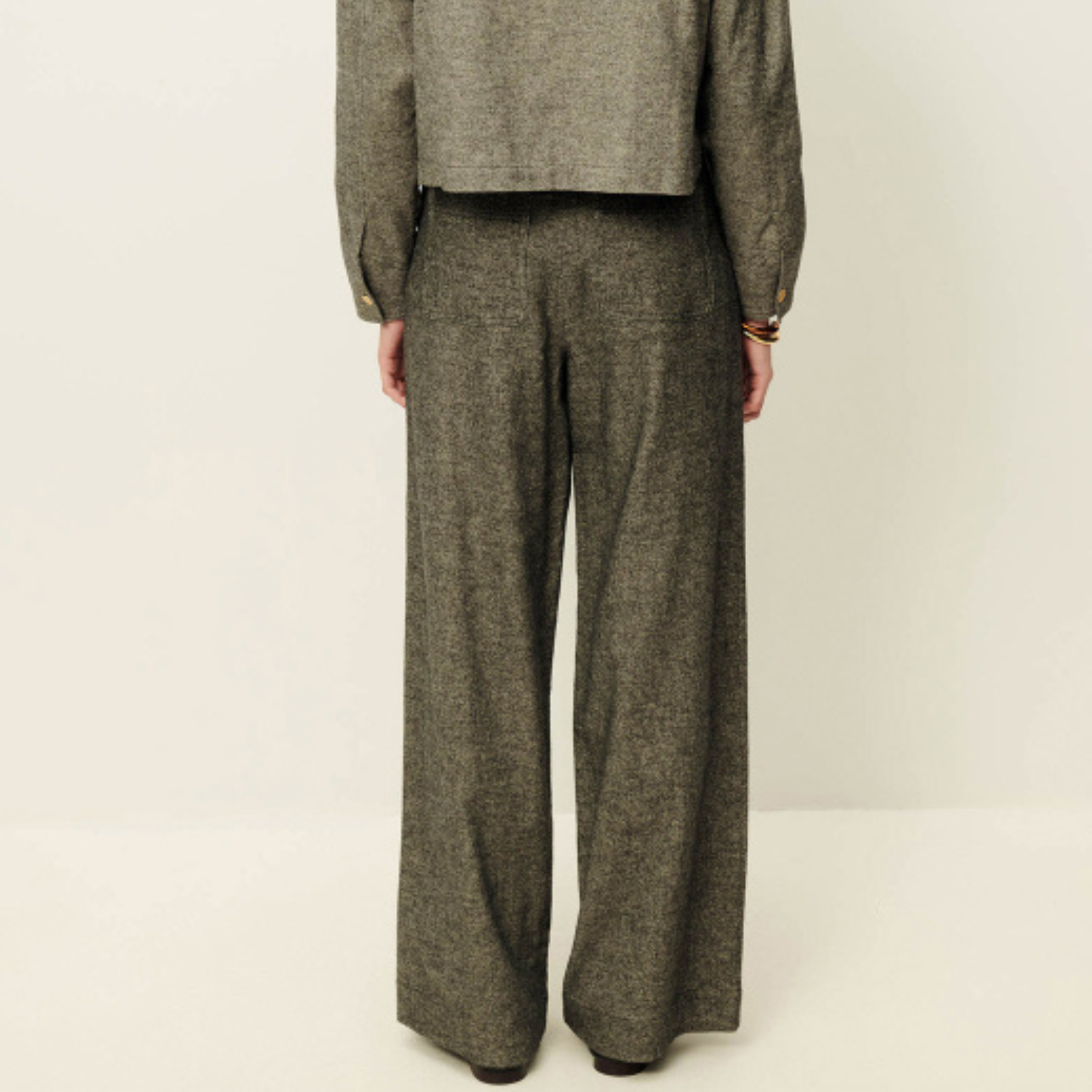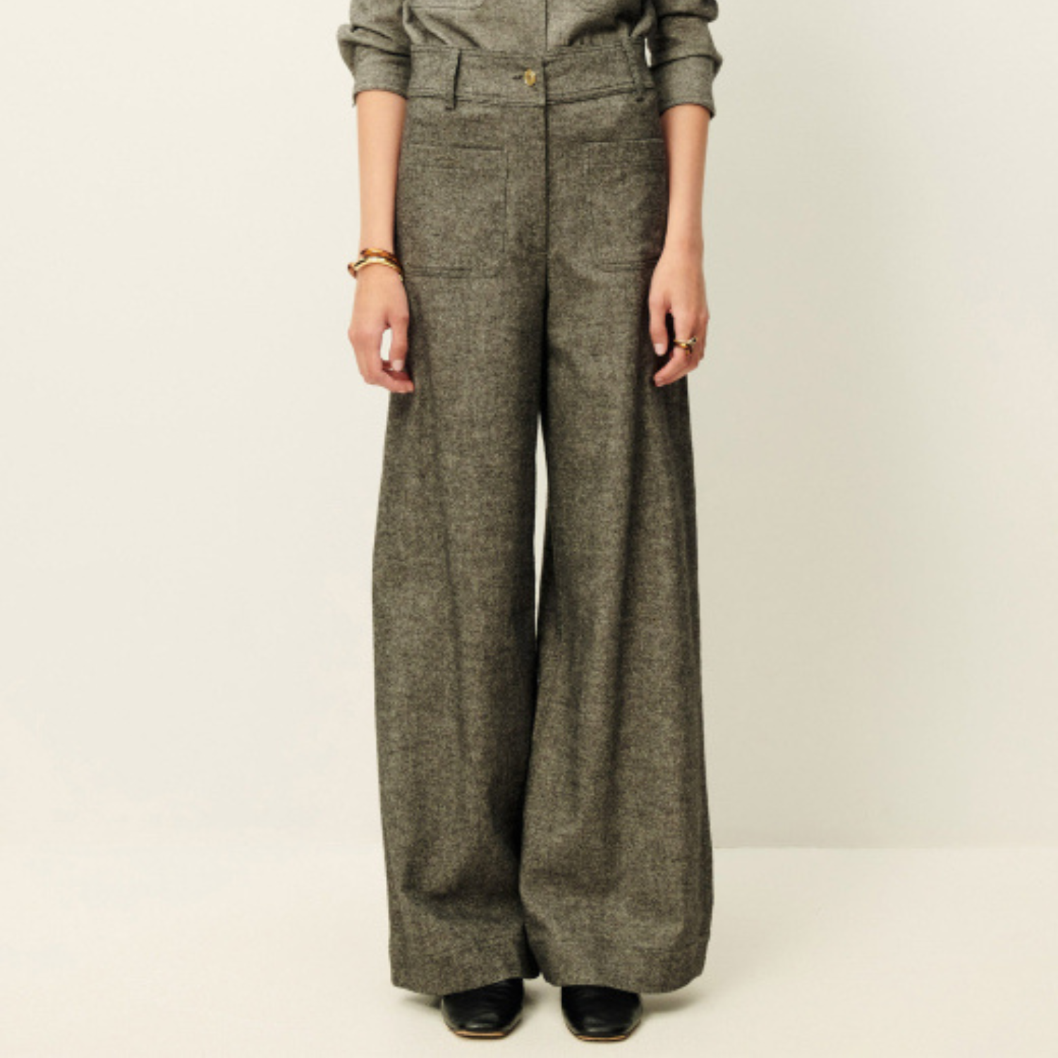 De Manhatti Wide Pants in de kleur Estompe, van Sessùn, is een stijlvolle pantalon die klassieke elegantie combineert met een moderne snit. Deze broek heeft een hoge taille en extra wijde pijpen, wat zorgt voor een mooi vallend en flatterend silhouet. De brede tailleband met riemlussen en de opgestikte zakken aan de voorkant geven de broek een subtiel utilitair detail, terwijl de soepele wolmix een luxe en comfortabele uitstraling biedt. De verfijnde grijstint ‘Estompe’ maakt dit item tijdloos en veelzijdig, ideaal voor zowel zakelijke als casual gelegenheden.