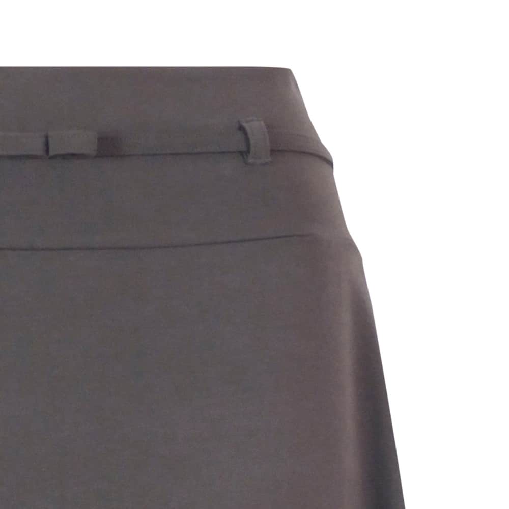 Simpel gerend rokje van een iets stevige katoenen jersey in een donkerbruine kleur. Aan de bovenzijde van het rokje zit een vast ceintuurtje in dezelfde kleur als de rok.
