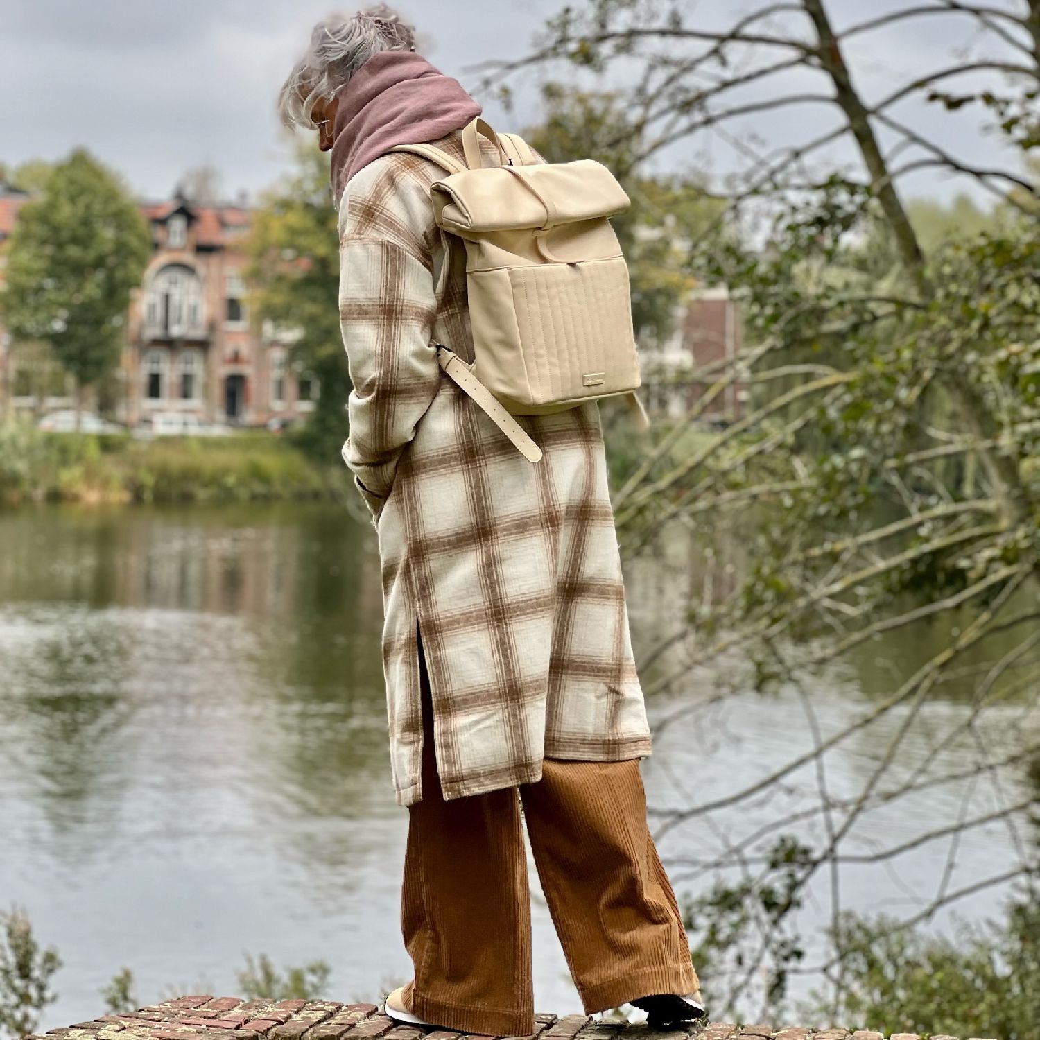 Herb backpack in de kleur: Milk van Monk and Anna is een mooie rugtas gemaakt van een mat ‘vegan leather’ in beige. De binnenkant is afgewerkt met een ‘washed linen’. De rugzak heeft 3 vakken namelijk een groot hoofdvak, een kleiner binnenvak wat handig is voor je laptop en op de voorkant zit nog een vak welke je afsluit met een rits. Het grote hoofdvak klap je dubbel en maakt je vast met een riempje.