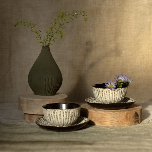 Het is gemaakt van porseleinklei altijd met de hand afgewerkt, dan wel met een matte glazuur, in relief of bewerkt met een fijn patroon.