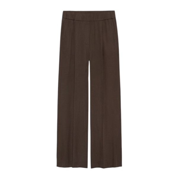 De Moonflower Pants in de kleur Dark Brown van Alchemist is een wijdvallende broek met een elegante, nonchalante uitstraling. Het model heeft een bandplooi en een comfortabele elastische tailleband, wat zorgt voor een moeiteloze pasvorm.