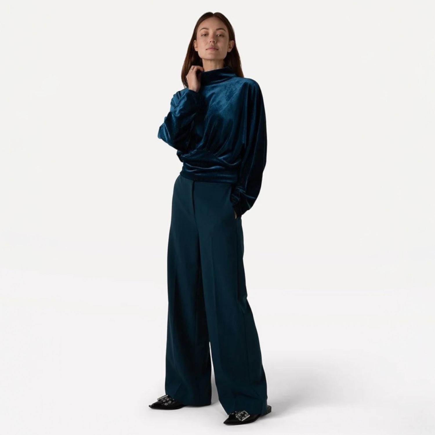 Moore Pants in de kleur Reflecting Pond, van het label Another Label. Deze lange broek met wijde pijpen heeft een taillebandsluiting met gulp en ritssluiting. De stof is een zware viscosemix. Aan de achterzijde zitten twee neppe broekzakken. De broek heeft een wijdere pasvorm, dus hij is een klein beetje oversized. Als je een getailleerde look wilt, raden wij aan om een maat kleiner te bestellen.