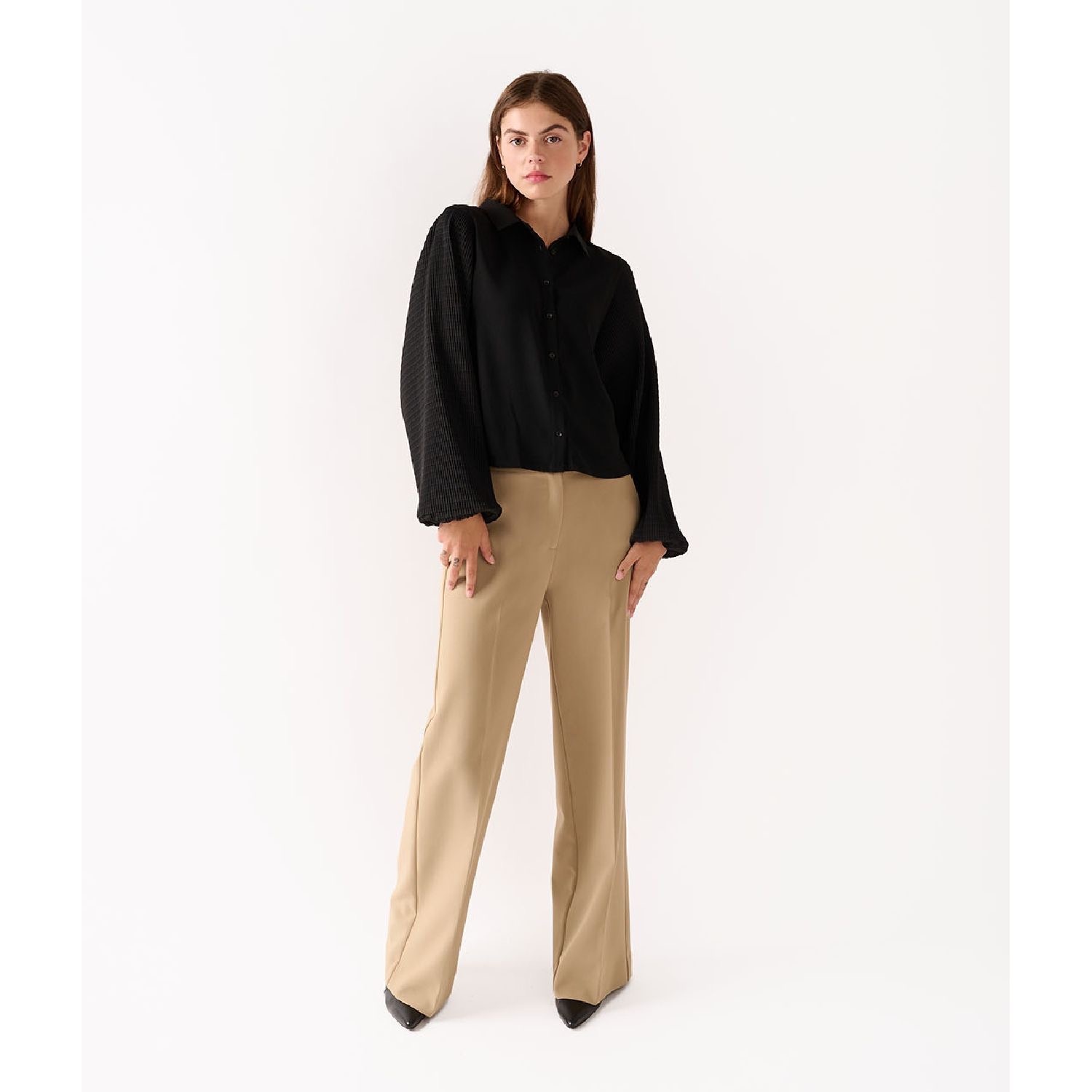 De broek met rechte pijp heeft een tailleband en ritssluiting met haak en oogje. Het model heeft een normale pasvorm en heeft ingeperste plooi over het voorbeen voor een mooie tailoring-look. Aan de achterkant zitten twee fake paspelzakken.