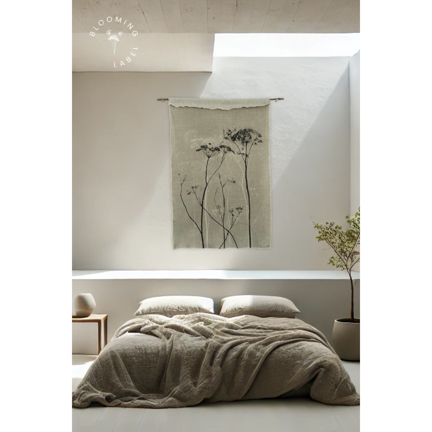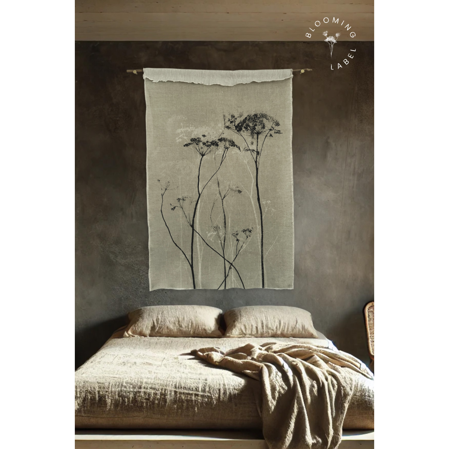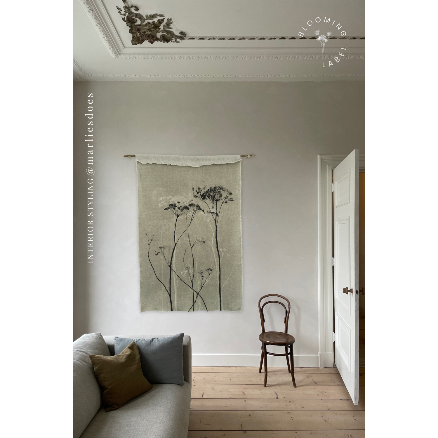 Het Mysterium Greyish Mint Wandkleed, van het label Blooming Label, is een delicaat botanisch wandkleed en vangt de stille poëzie van de natuur, waar fijne stengels en wilde bloemen elegant naar het licht reiken. Het wandkleed is gedrukt op zacht linnen, en deze natuurlijke textuur voegt een aardse, warm, karakteristieke uitstraling toe aan je ruimte.
