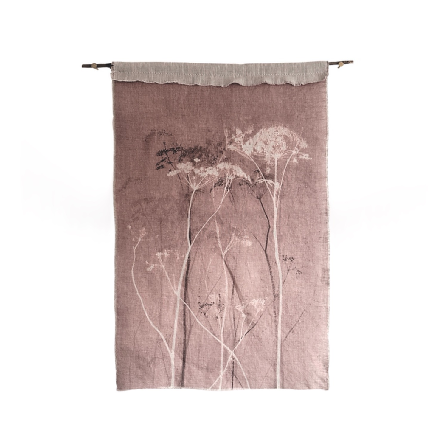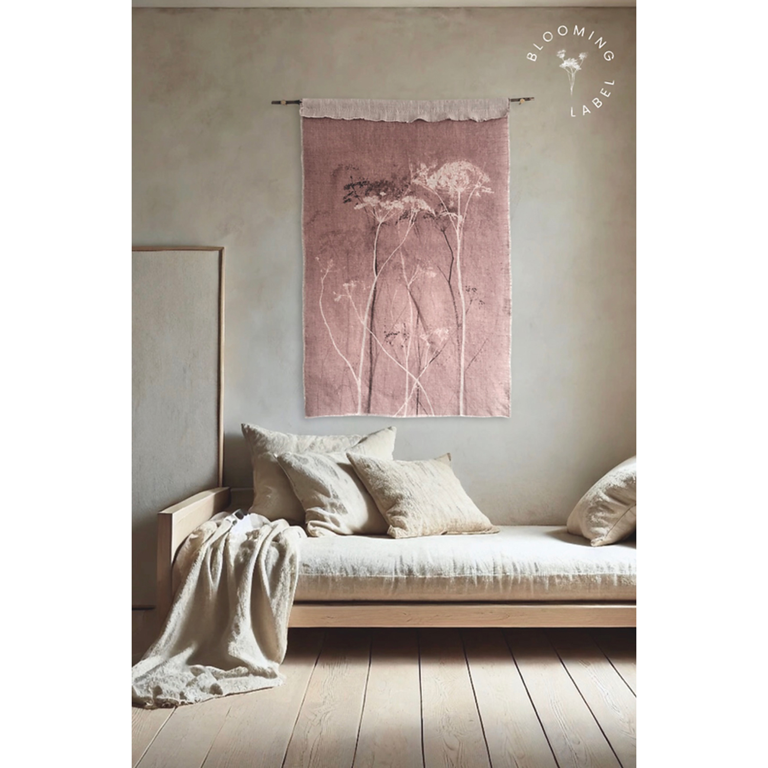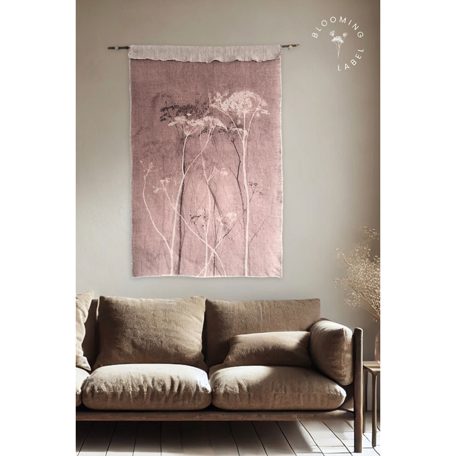 Het Mysterium Lilac Blush Wandkleed, van het label Blooming Label, is een delicaat botanisch wandkleed en vangt de stille poëzie van de natuur, waar fijne stengels en wilde bloemen elegant naar het licht reiken. Het wandkleed is gedrukt op zacht linnen, en deze natuurlijke textuur voegt een aardse, warm, karakteristieke uitstraling toe aan je ruimte.