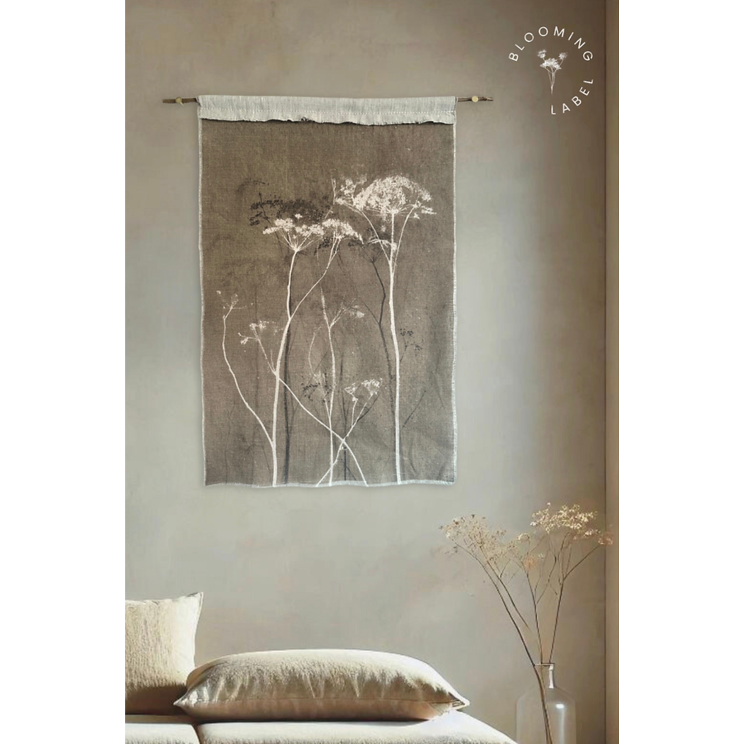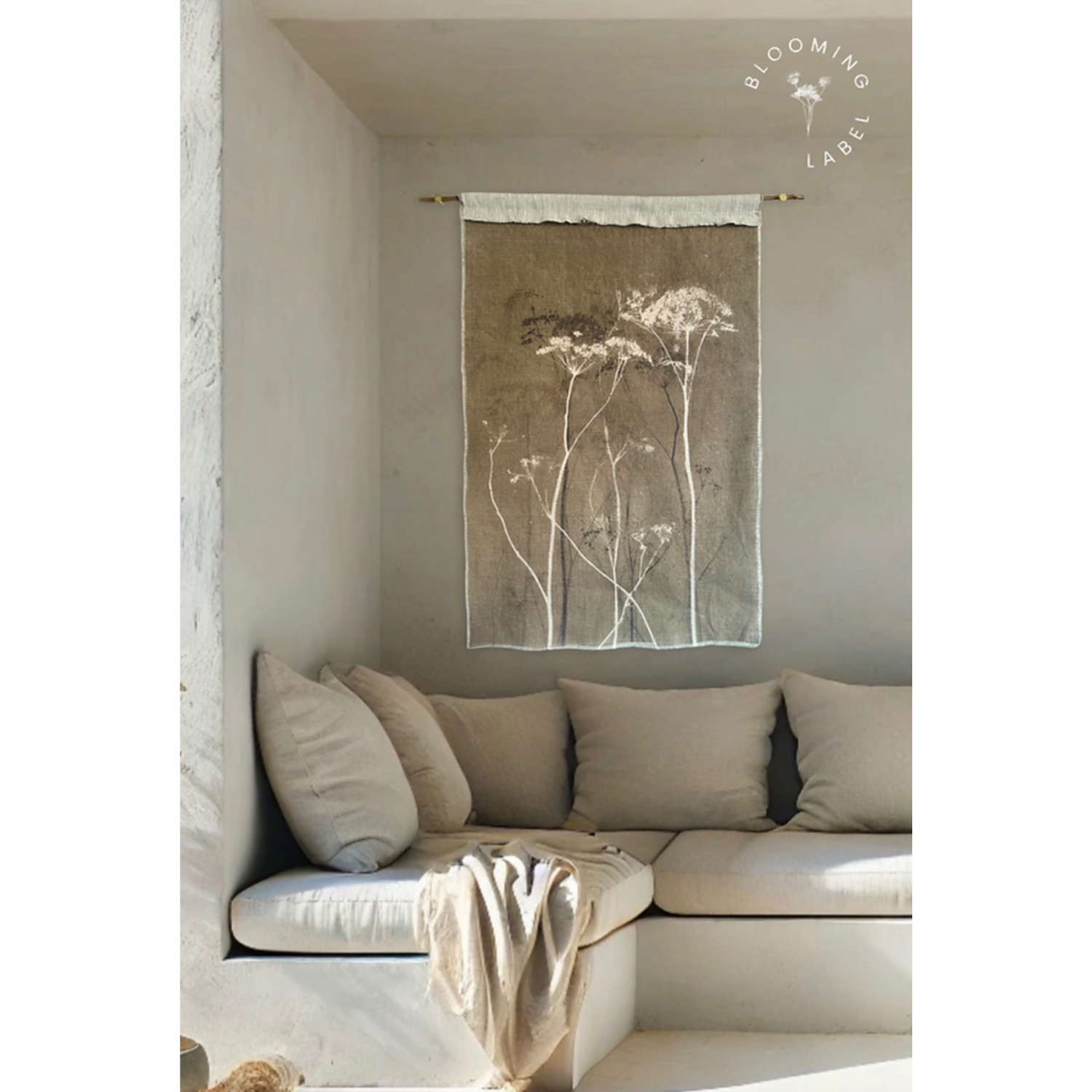 Het Mysterium Pale Olive Wandkleed, van het label Blooming Label, is een delicaat botanisch wandkleed en vangt de stille poëzie van de natuur, waar fijne stengels en wilde bloemen elegant naar het licht reiken. Het wandkleed is gedrukt op zacht linnen, en deze natuurlijke textuur voegt een aardse, warm, karakteristieke uitstraling toe aan je ruimte.