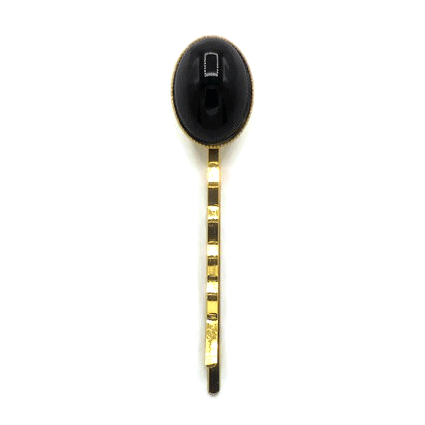 Haarspeld met zwarte natuursteen op goudkleurige speld. Het blijft stevig in het haar zitten.