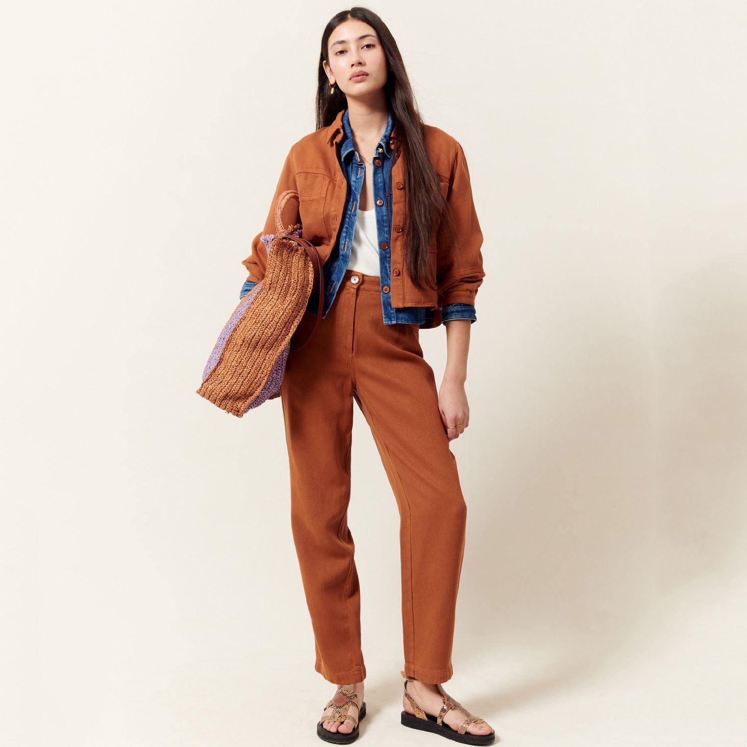 De Nica pants in de kleur Lao Sunset, van het label Sessùn. Een mooie afgewerkte high-rise broek, in een mooie donker oranje kleur. De perfect broek voor een vrolijke lente look. De broek is gemaakt van lyocell, die afkomstig is uit gecertificeerde en duurzaam beheerde bossen.