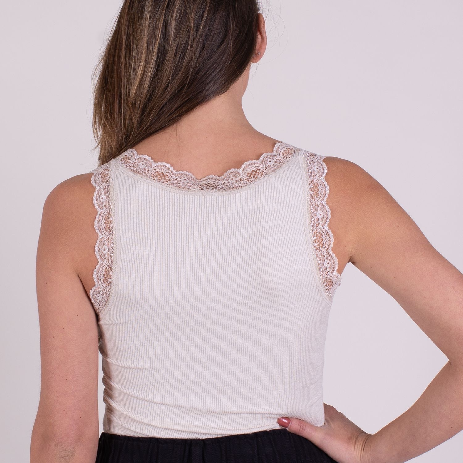 Deze prachtige top heeft een ronde hals en is afgewerkt aan zowel de voor- als achterkant met geschulpt kant. De top is gemaakt van een soepele, zacht geborstelde viscose jersey met extra stretch en is in de kleur beige.