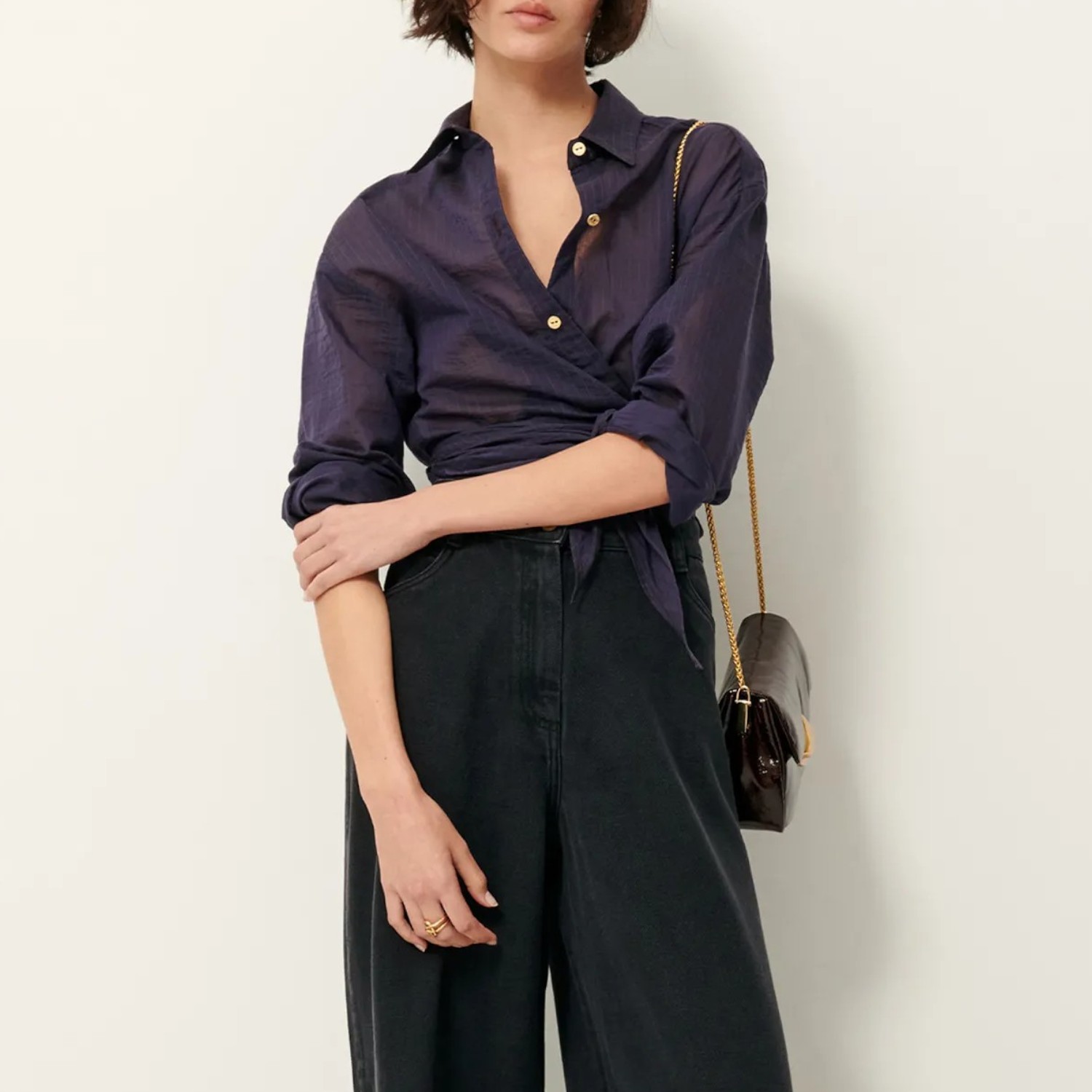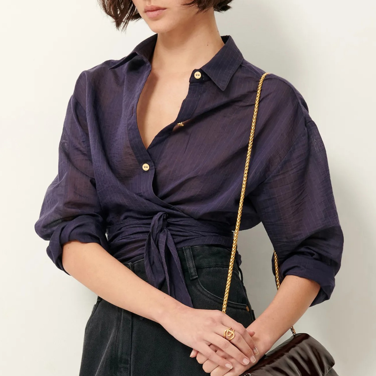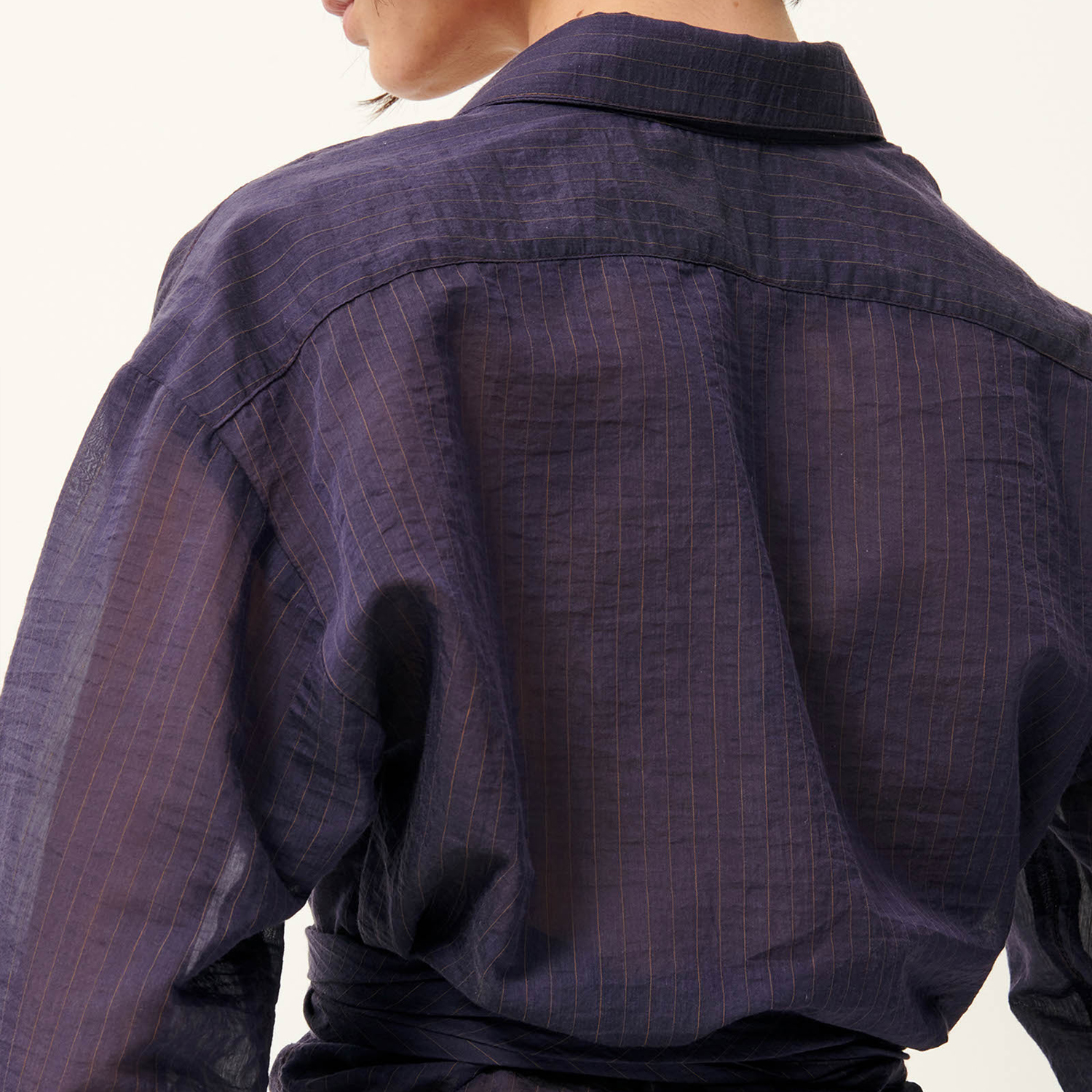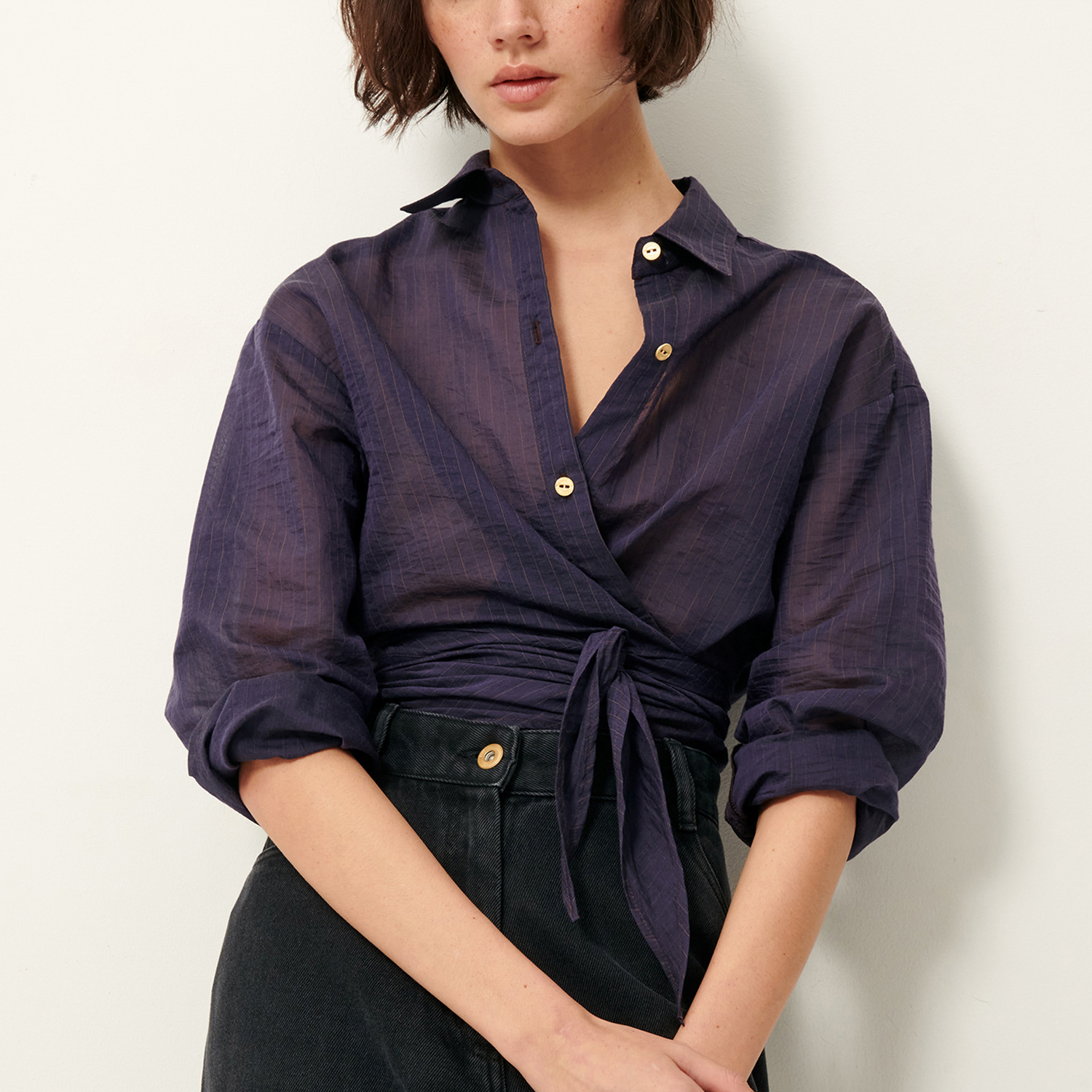 De Procilong Chemise in de kleur Bloo, van het label Sessún. Dit gestreepte overhemd, in een diep donkerblauw met subtiele oranje lijntjes, geeft een frisse twist aan klassieke stijlen. Het overslagdesign maakt het mogelijk om de top prachtig in de taille vast te strikken, waardoor je figuur mooi benadrukt wordt. Met zijn hele stoere en boheemse look is deze blouse perfect voor zowel casual als meer chique gelegenheden.