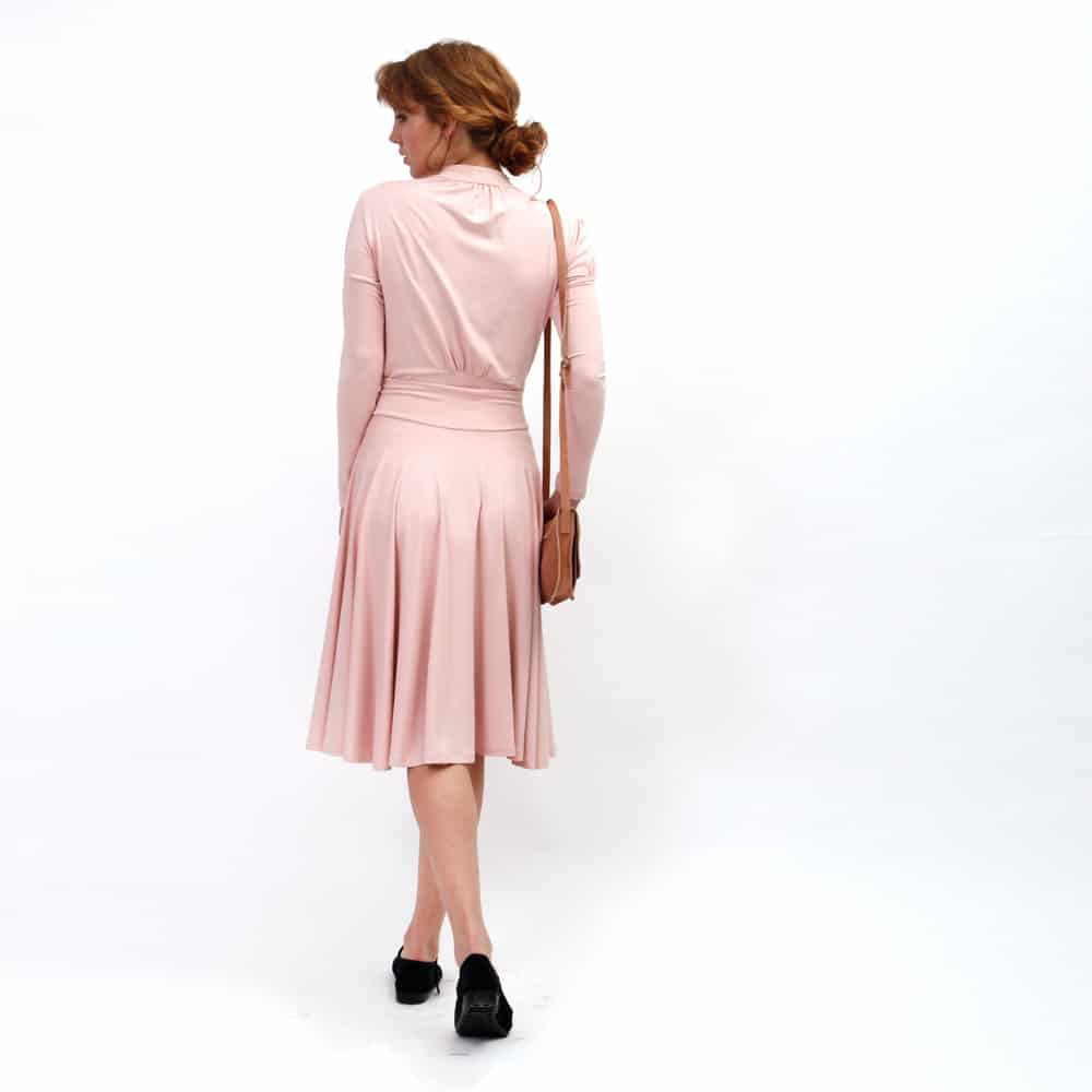 Dit shirt in bleekroze kleur, draag je iets gerimpeld op rok of broek. Het heeft een lange mouw met van boven een pofmouwtje. Een druppelvormig splitje bij de hals en het sluit met een wat breder striklint.