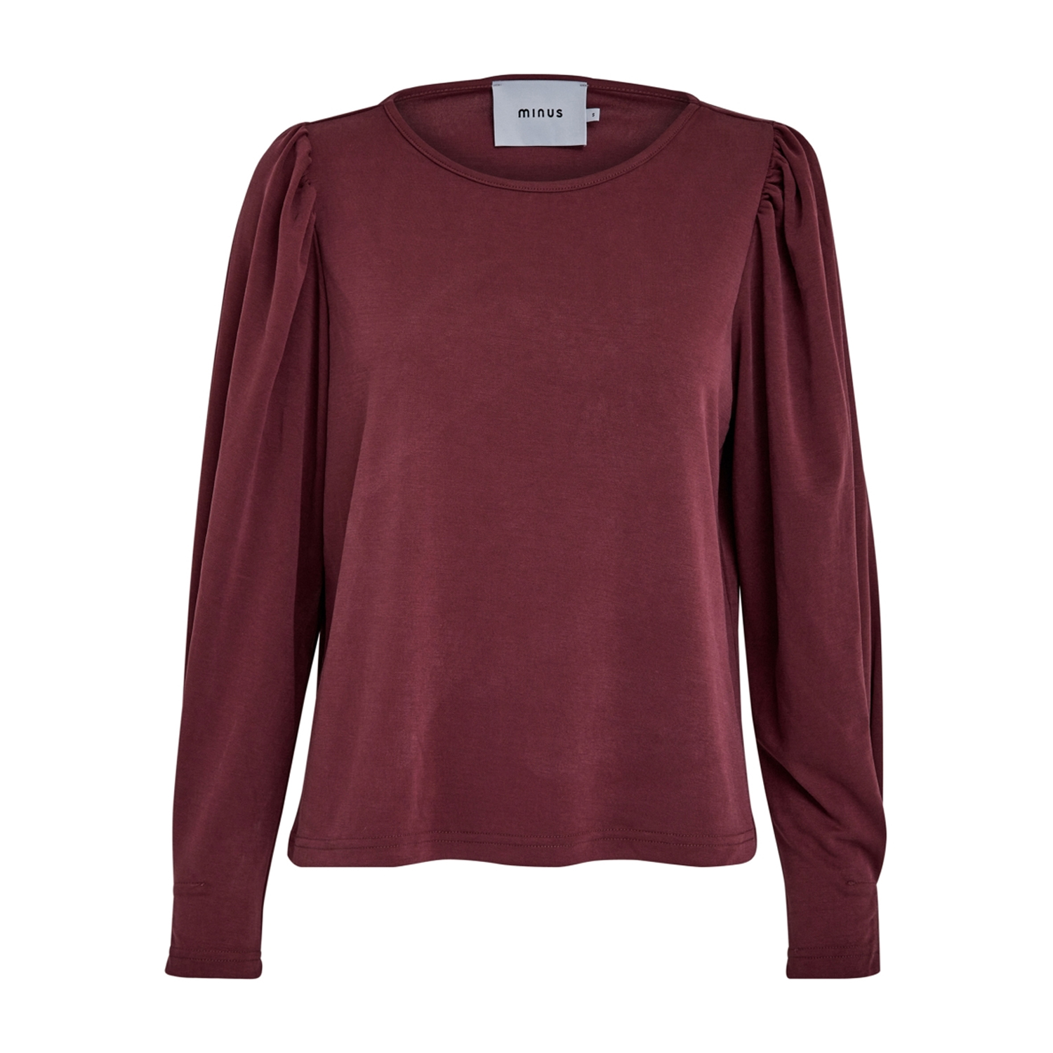 De Reyna Long Sleeve Modal Blouse in de kleur Port Royal van het Deense label Minus. Het is een veelzijdige basic in een warme wijnrode kleur, gemaakt van een comfortabele modalmix, die zacht aanvoelt, ademend is en weinig kreukt. Deze blouse heeft elegante pofmouwen en een comfortabele crewneck.