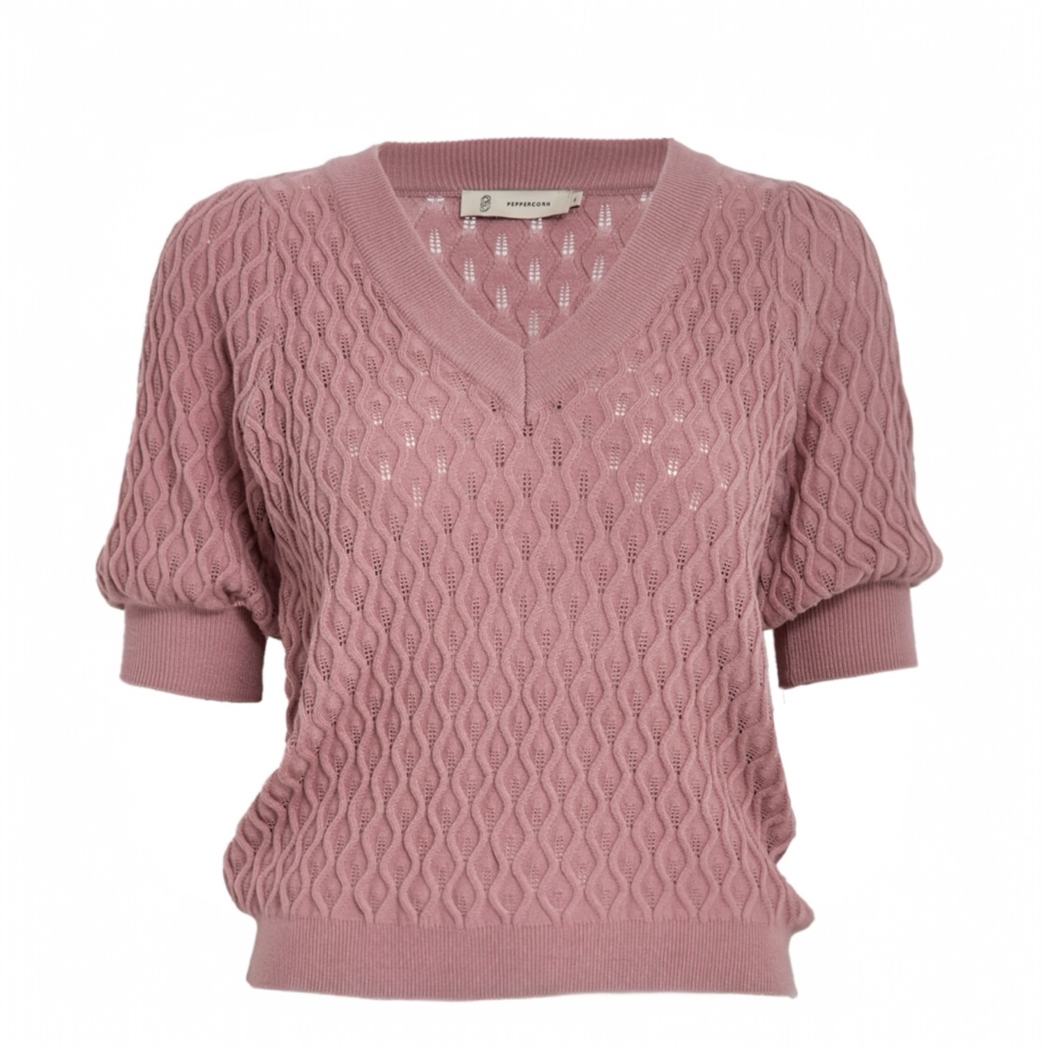 De Rosalia Puff Sleeve Knit Tee in de kleur Ash Rose, van het label Peppercorn. Het is gebreid in een mooi ajourpatroon. Het shirt heeft pofmouwen en precies een goede V-hals.