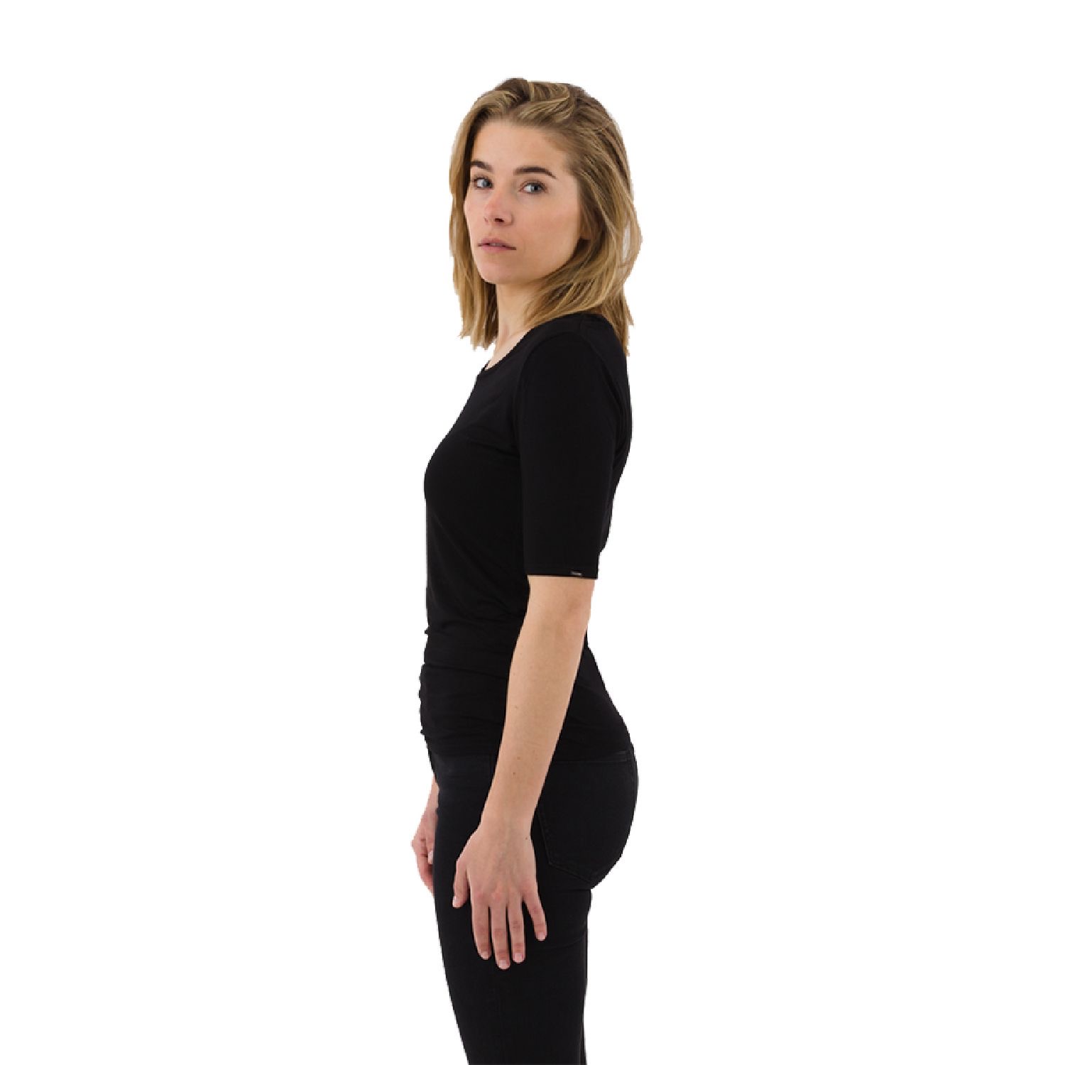 De lengte is tot op de heupen en de mouwen eindigen net boven de elleboog. Dankzij de ronde neklijn is dit shirt een ideale basis voor een zakelijke look maar ook als ideale dagelijkse stijlvolle basic. Draag hem ergens onder, of gewoon als bovenkleding.