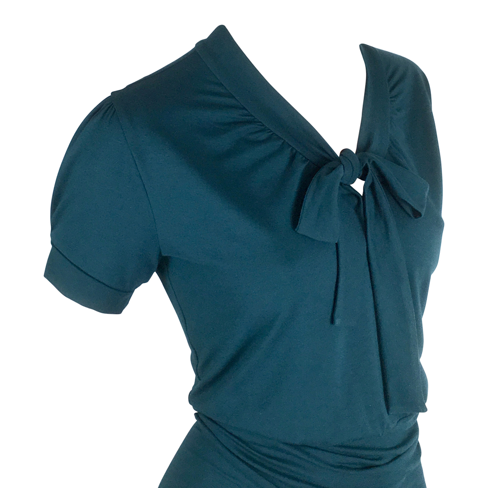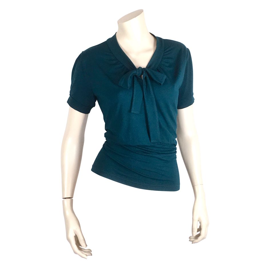 Dit shirt in een diep petrolblauwe kleur heeft een V-hals voor en sluit met een breder striklint. Het heeft een korte pofmouw. Aan de onderzijde een brede band die je wat gerimpeld draagt rondom je taille.