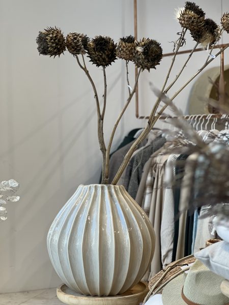Creëer een prachtig stilleven met de Wide vaas van het Deense label Broste Copenhagen. De vaas is gemaakt van geglazuurd keramiek met een eenvoudig gegolfde structuur in een stijlvolle beige kleur. In het geglazuurd een craquelé effect wat leven geeft aan de vaas. Het is al een mooi object op zichzelf maar ook prachtig met een paar takken of bloemen erin.