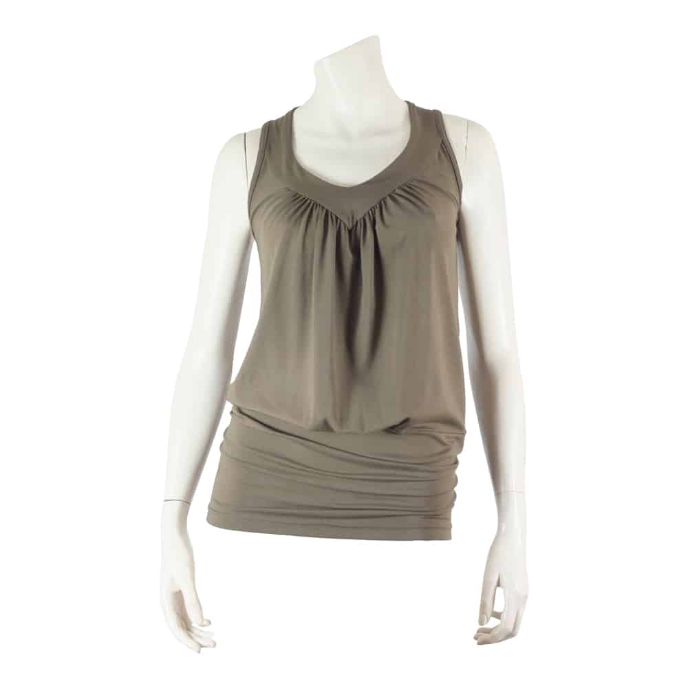 Deze top in donker kaki, draag je iets gerimpeld op rok of broek. Het heeft een bijzonder charmante aangerimpelde V-hals met een pasje.