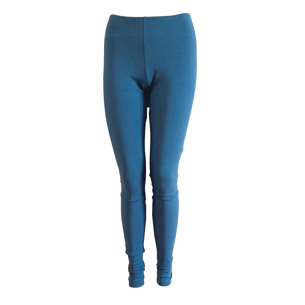 Deze legging van katoen, in een petrol blauwe kleur, is aan de bovenzijde afgewerkt met een afstekend picotelastiek. Het heeft een naadje net onder de knie. En het fijne is dat hij erg lang is. Dus het rimpelt wat bij je enkel.