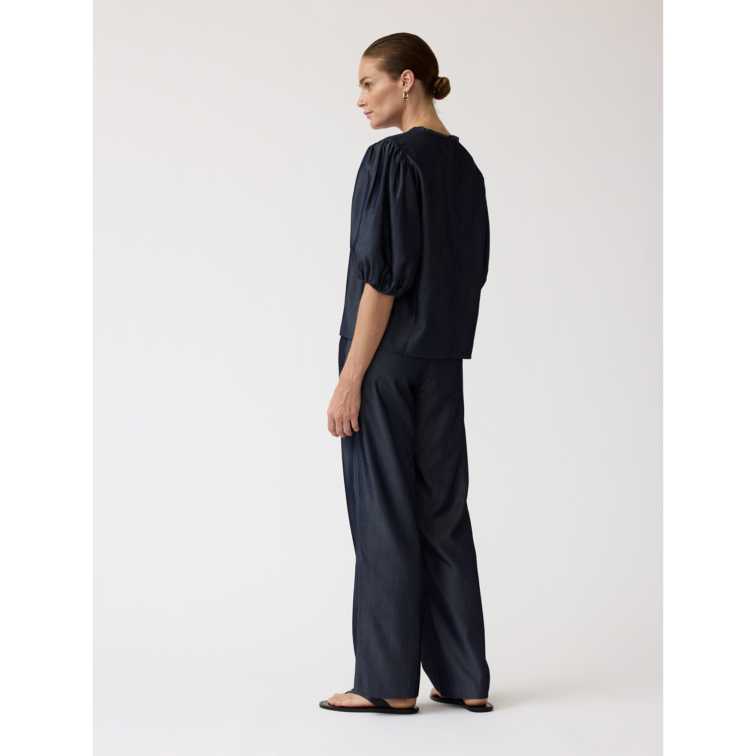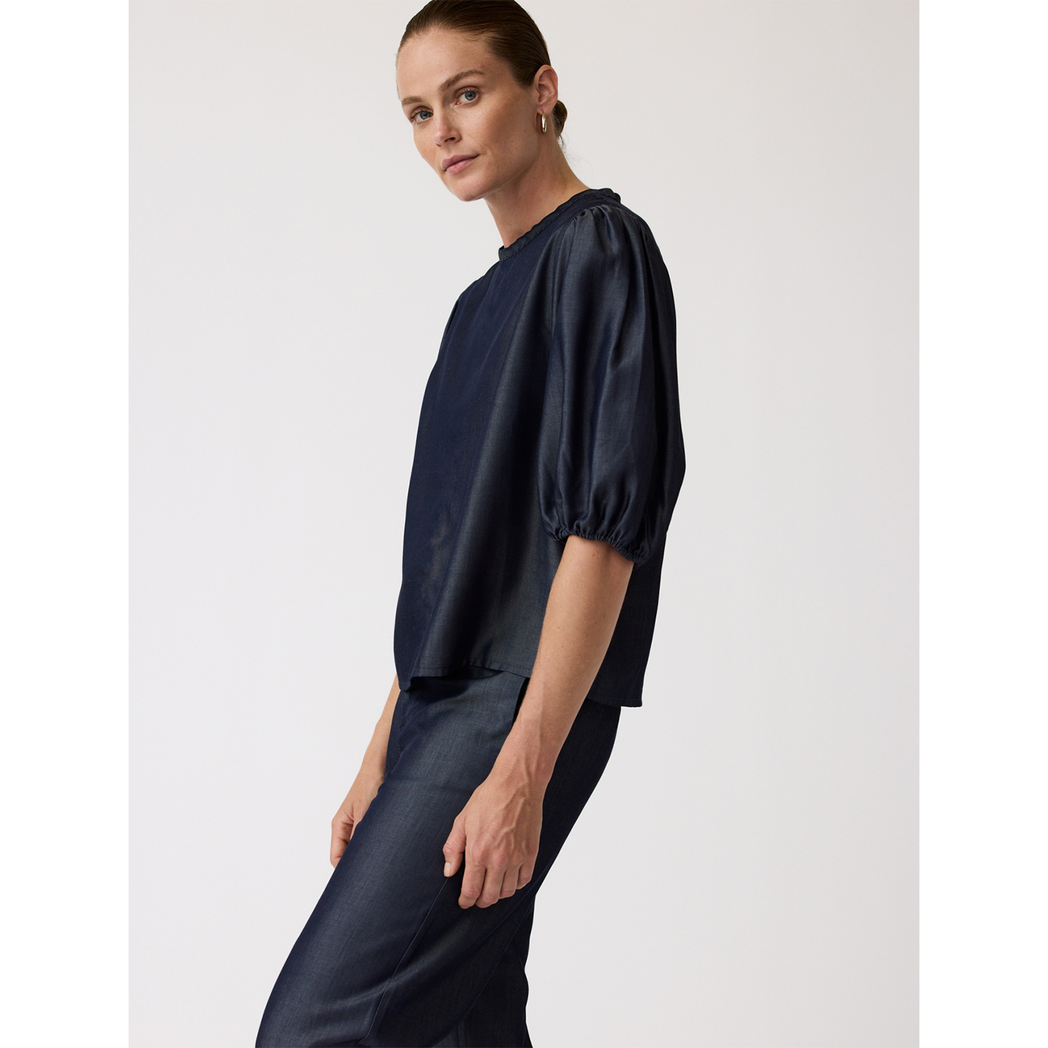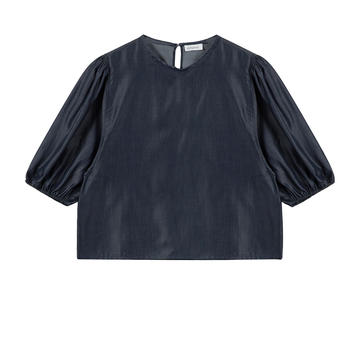 De Violet Top in Dark Indigo van het duurzame, Nederlandse label Alchemist. Dit iets kortere model combineert een tijdloze uitstraling met moderne details, waardoor het een veelzijdige keuze is voor allerlei gelegenheden. Halflange pofmouwen creëren een speels silhouet, terwijl de ronde halslijn een tijdloze charme uitstraalt die eenvoudig te combineren is met allerlei outfits en stijlen.