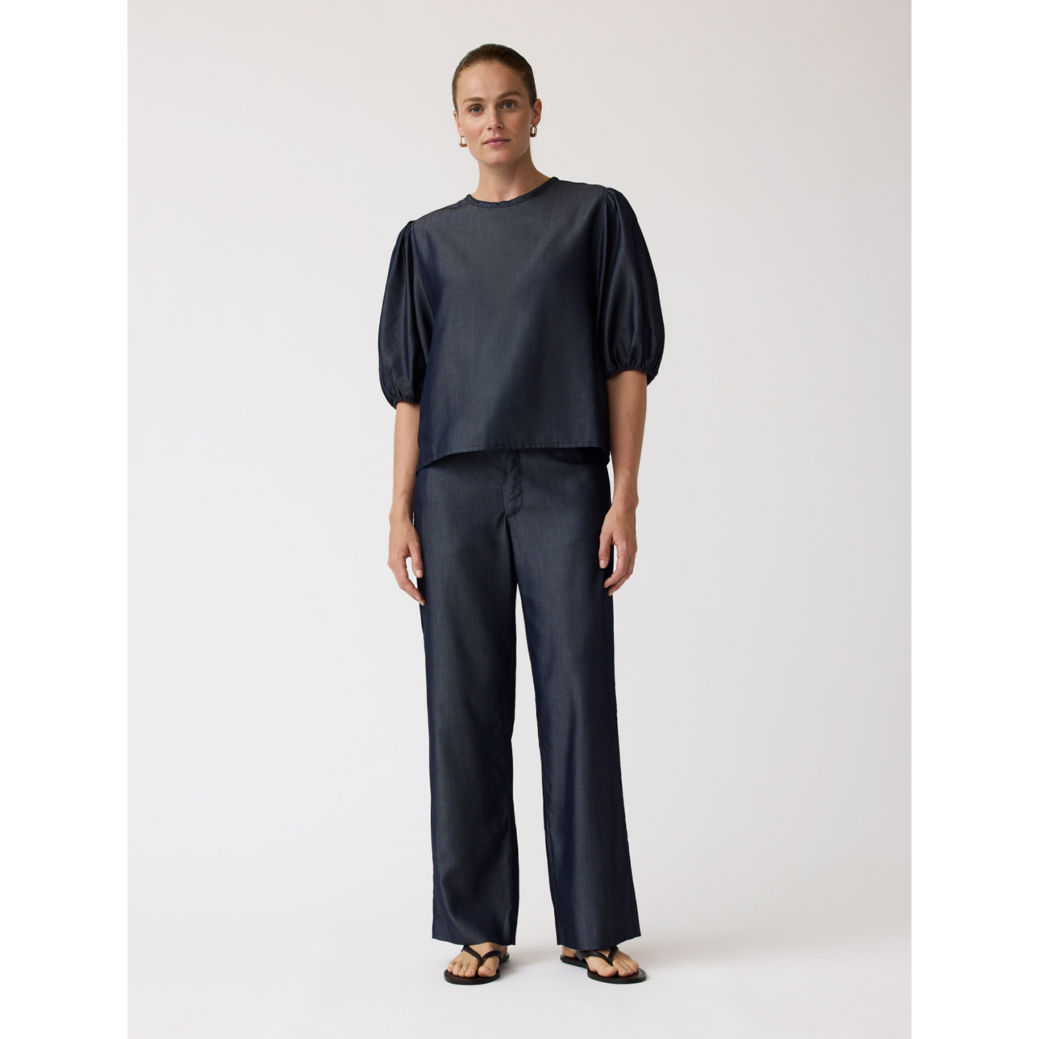De Violet Top in de kleur Dark Indigo van het duurzame, Nederlandse label Alchemist. Dit iets kortere model combineert een tijdloze uitstraling met moderne details, waardoor het een veelzijdige keuze is voor allerlei gelegenheden. Halflange pofmouwen creëren een speels silhouet, terwijl de ronde halslijn een tijdloze charme uitstraalt die eenvoudig te combineren is met allerlei outfits en stijlen. Neem hier een kijkje tussen onze verschillende pantalons.